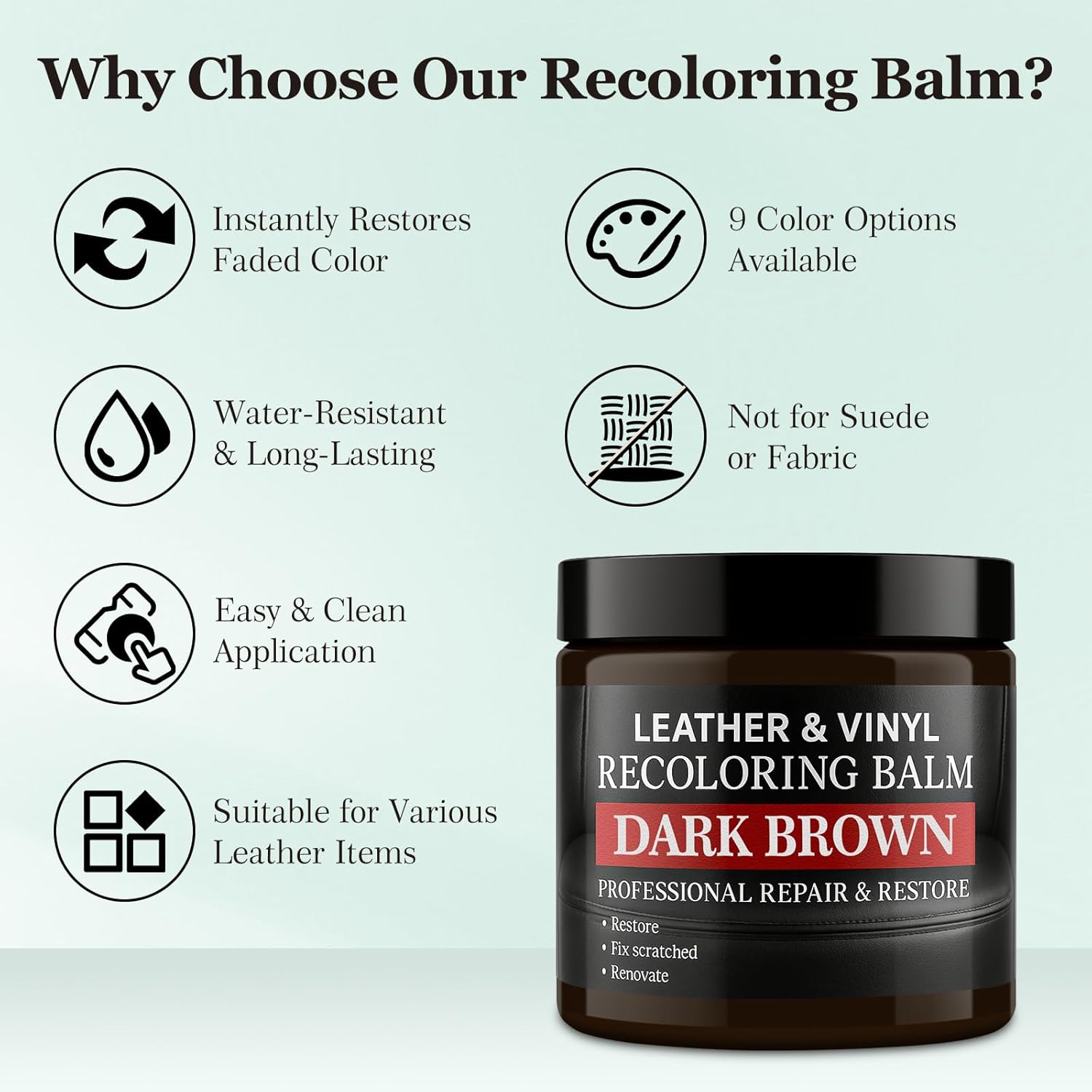 - Professional-Grade Leather Recoloring Balm:This premium leather recoloring balm works as a leather color restorer and leather dye for furniture, deeply penetrating the surface to bring back the original tone and luster of your leather items—perfect for sofas, recliners, jackets, and more.