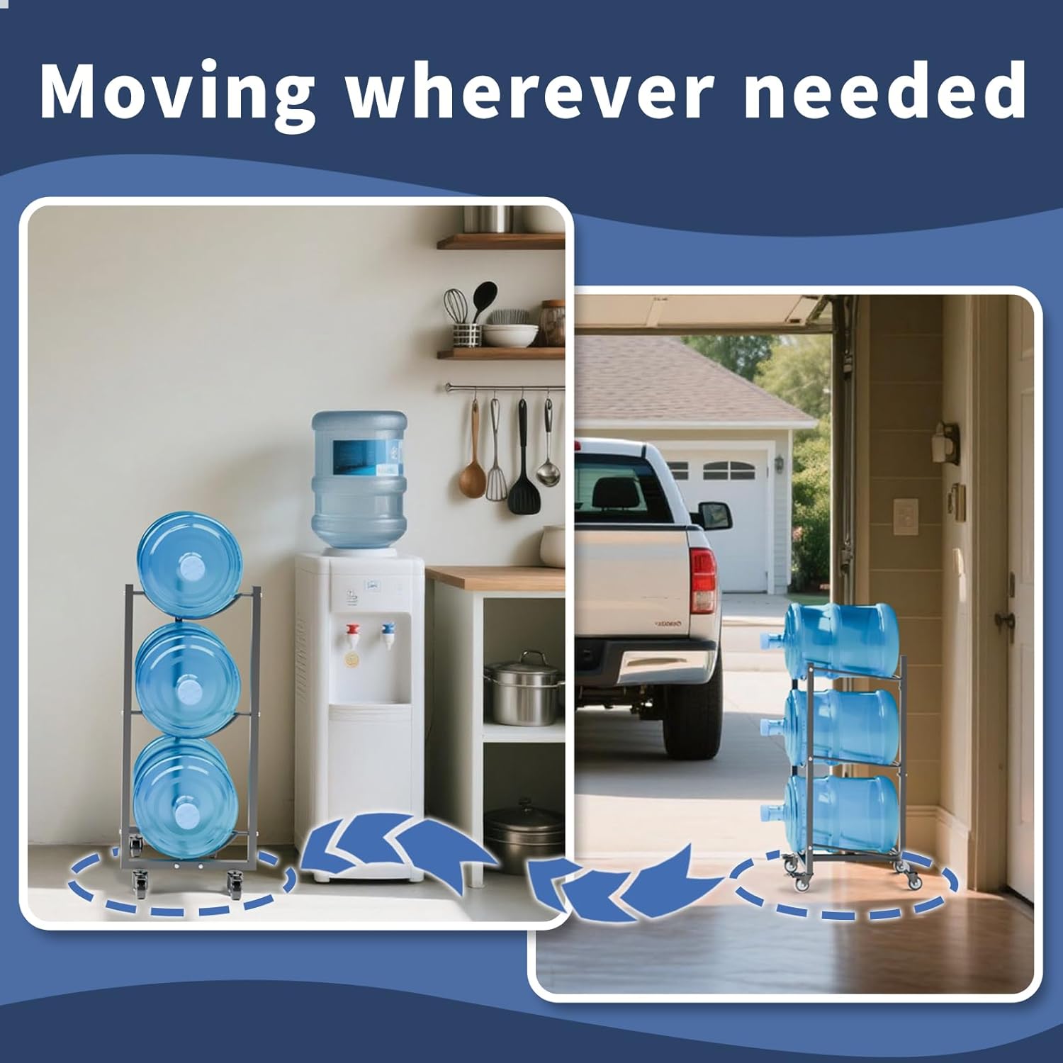 Water Jug Holder with 4 Wheels: 3 Tier Movable Gallon Bottle Storage Rack for Office Gym Garage - Black