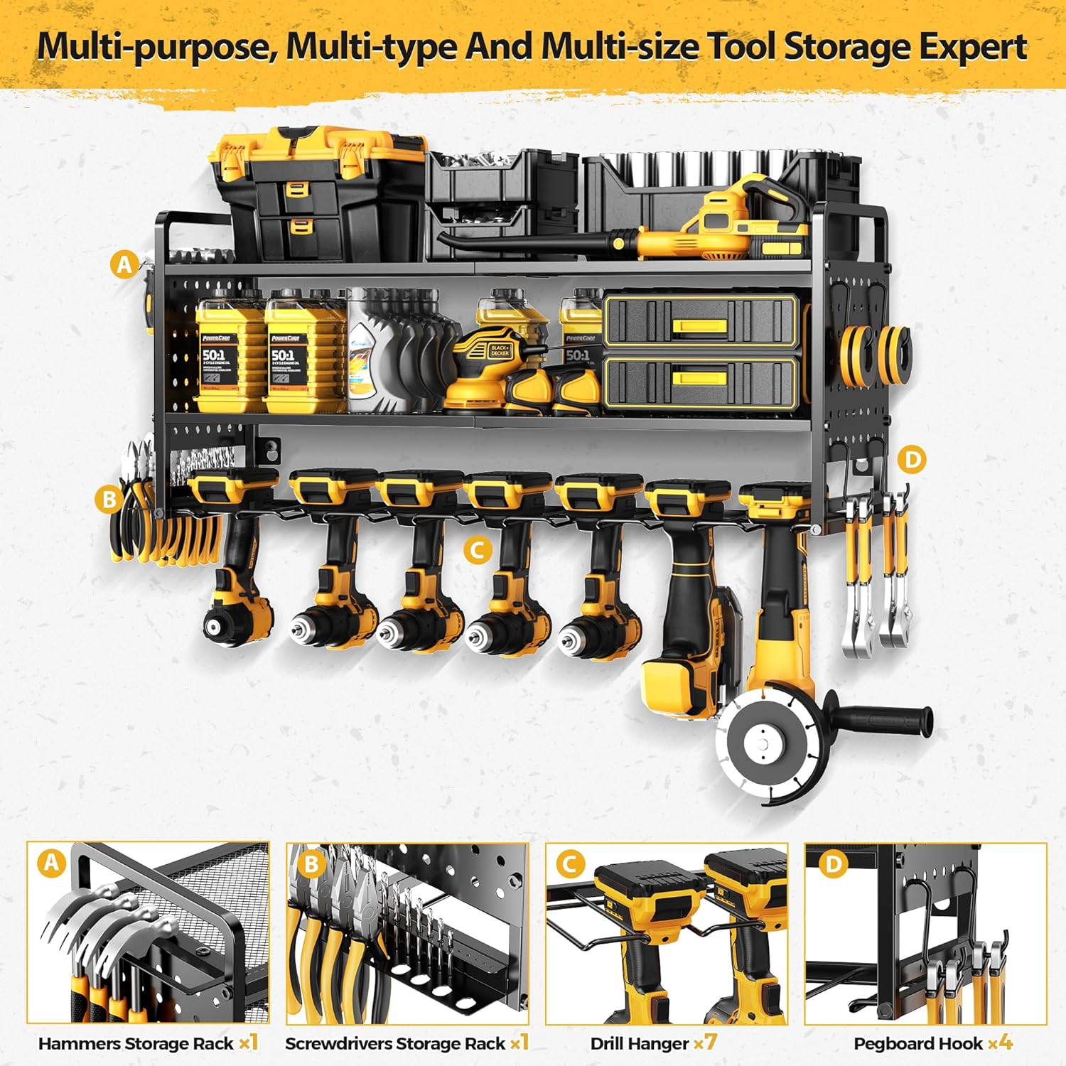 - 【Space-Saving Garage Tool Organization】This wall mounted power tool storage come with 7 drill slots, 4 hooks, hammers and screwdrivers storage rack, two shelves and two pegboard. It accommodates a variety of tools, ideal for garages, workshops, and tool rooms. Designed to keep workbenches clear and maximize storage, this organizer is essential for any professional or DIY enthusiast. Also Amazing christmas or father's day gift for men