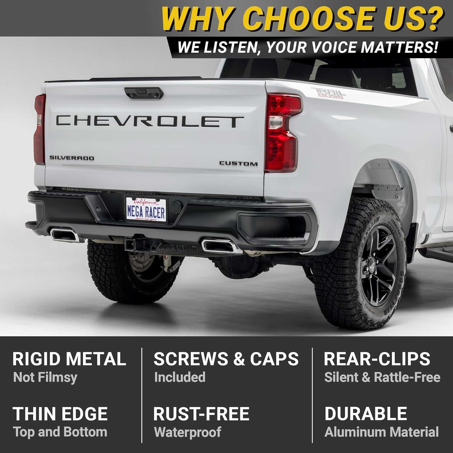 - CUSTOMER SERVICE: Mega Racer's 4 pack Black License Plate Frame automotive accessories will leave both you and your ride satisfied. If you have any questions please send us a message via Amazon Message and we will be sure to respond within 24 hours.