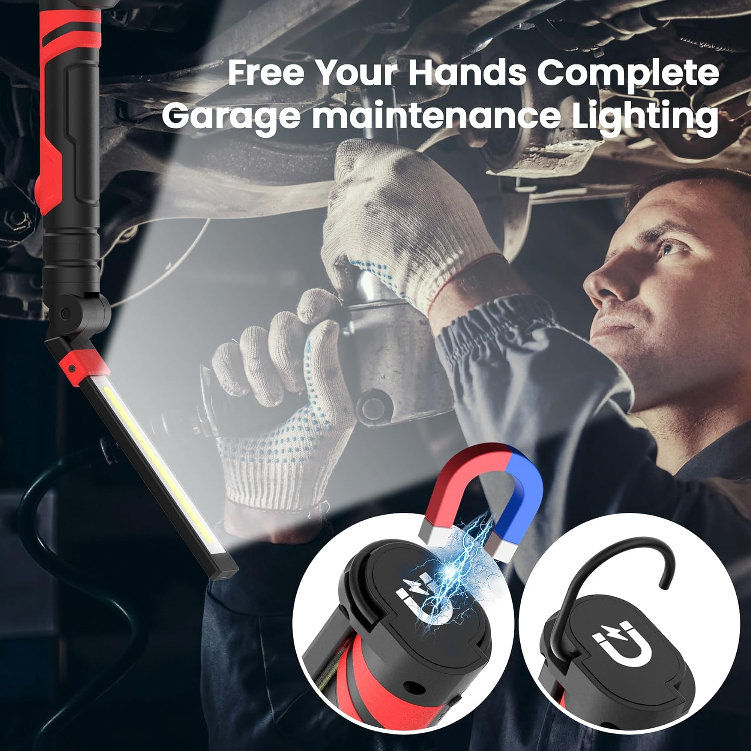 - Magnetic Base & Hook: Strong magnet securely attaches the rechargeable work light to metal surfaces for hands-free use. The hook design makes it easy to hang the magnetic work light for mechanics, camping, or emergencies.