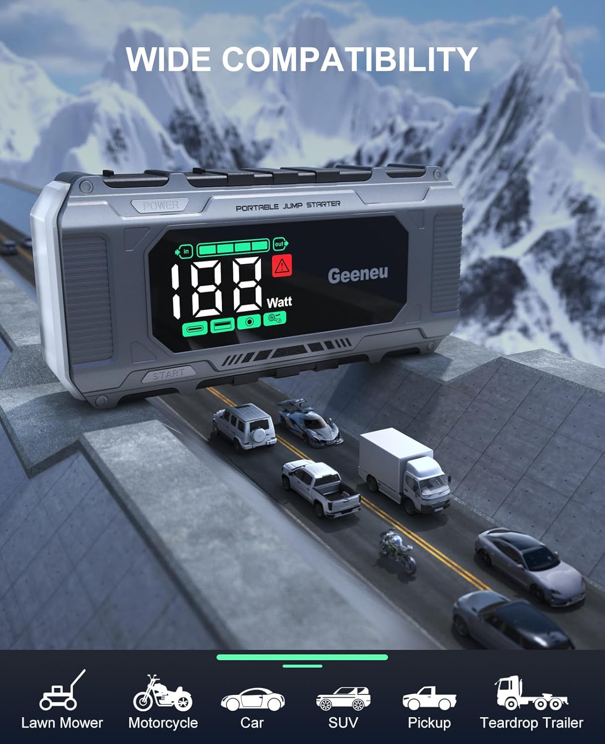 - HD LARGE LCD DISPLAY: Unlike traditional jump starters, this unit features a high-definition display that clearly shows all status indicators. You can easily keep track of battery level, charging wattage, and operational status – ensuring trouble-free use