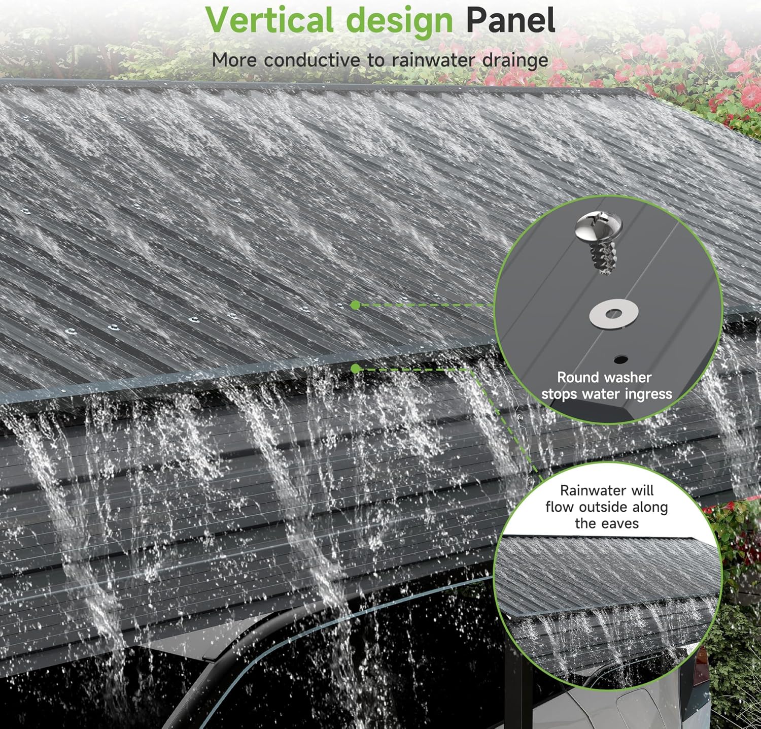 - Quick-Drain Design: Unlike ordinary carports, our carport features vertical stripes that guide rainwater away like tiny gutters, combined with sealed seams that lock out leaks