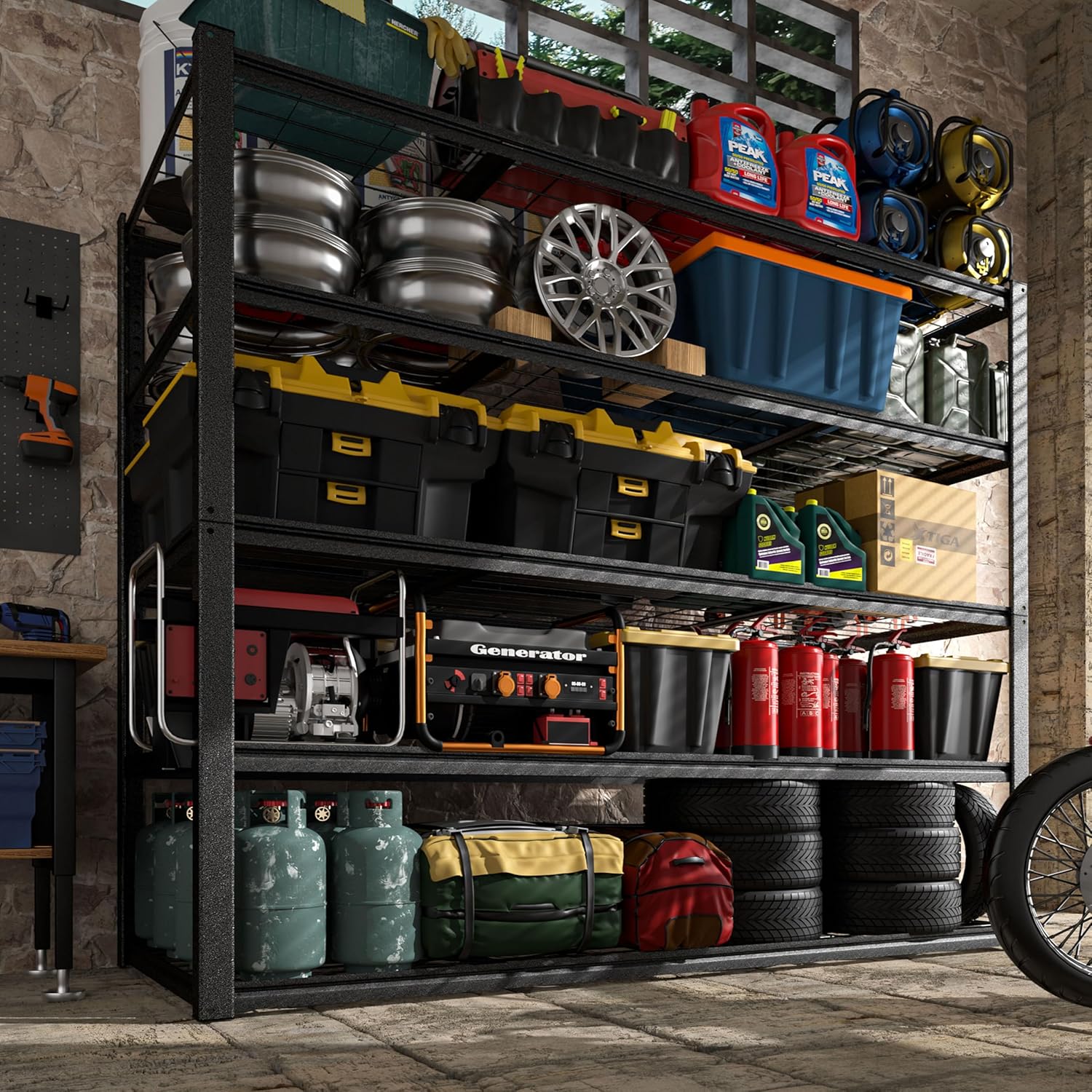 - Adjustable Shelves: These garage storage shelves are made of high-quality thick MDF boards and thicken metal steel frame with black powder coating. It is customizable with 1.58" increments to fit short and tall items.