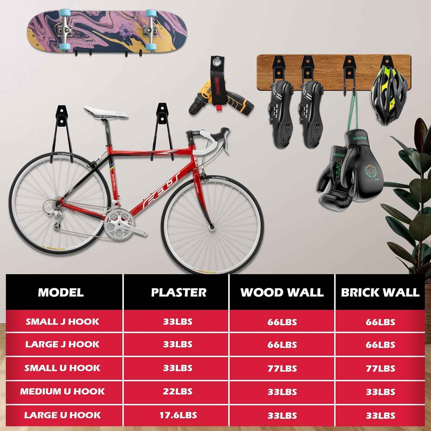 - EASY INSTALLATION - The included screws and anchors make mounting a breeze. Whether you're working with wood, concrete, or plaster, you can easily install these wall mount hooks to create an organized garage storage system