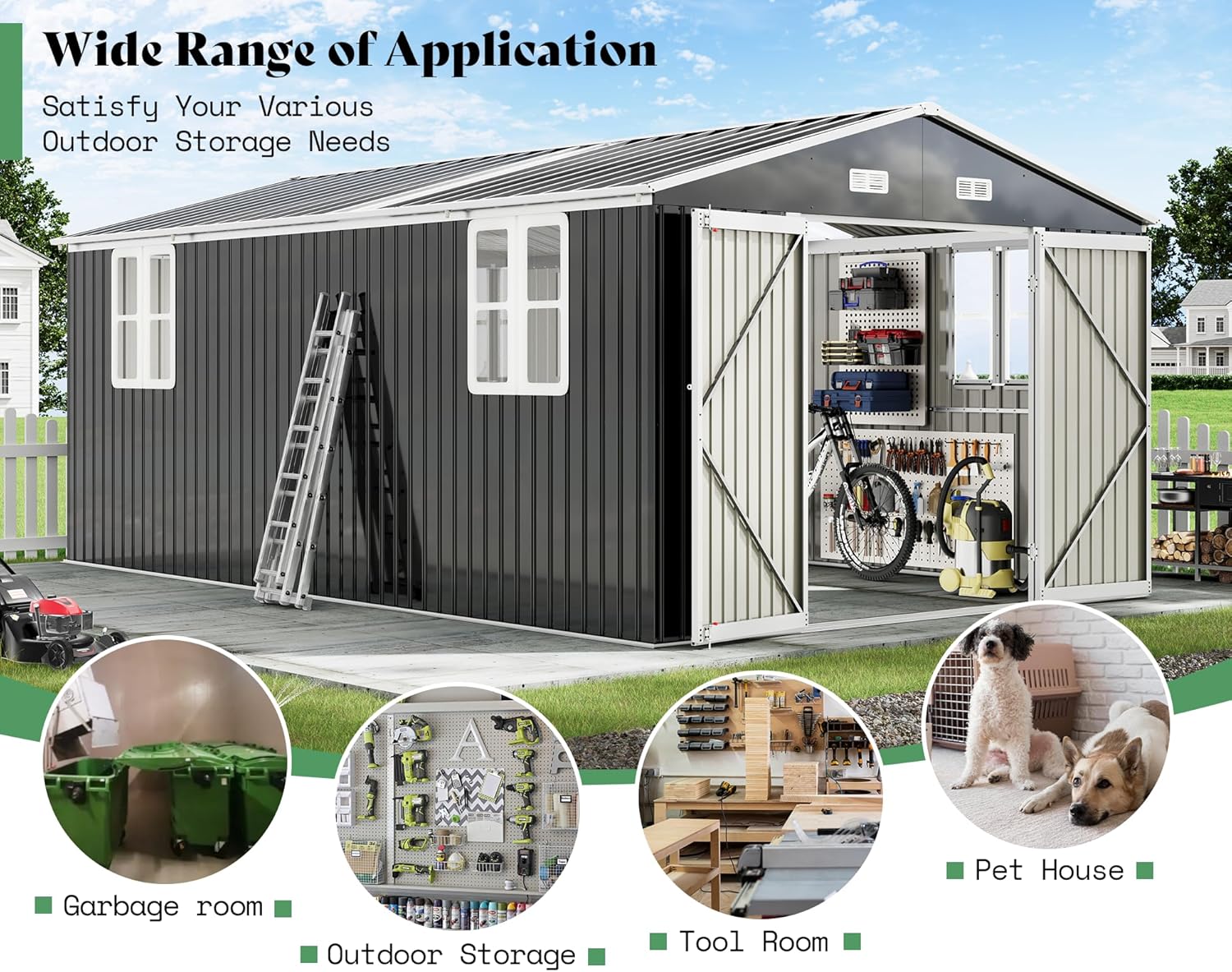 - Great Ventilation: The garden shed features hinged double doors and vents which ensures airflow, preventing the accumulation of moisture, Upgrade wall height gives you a cozy feeling