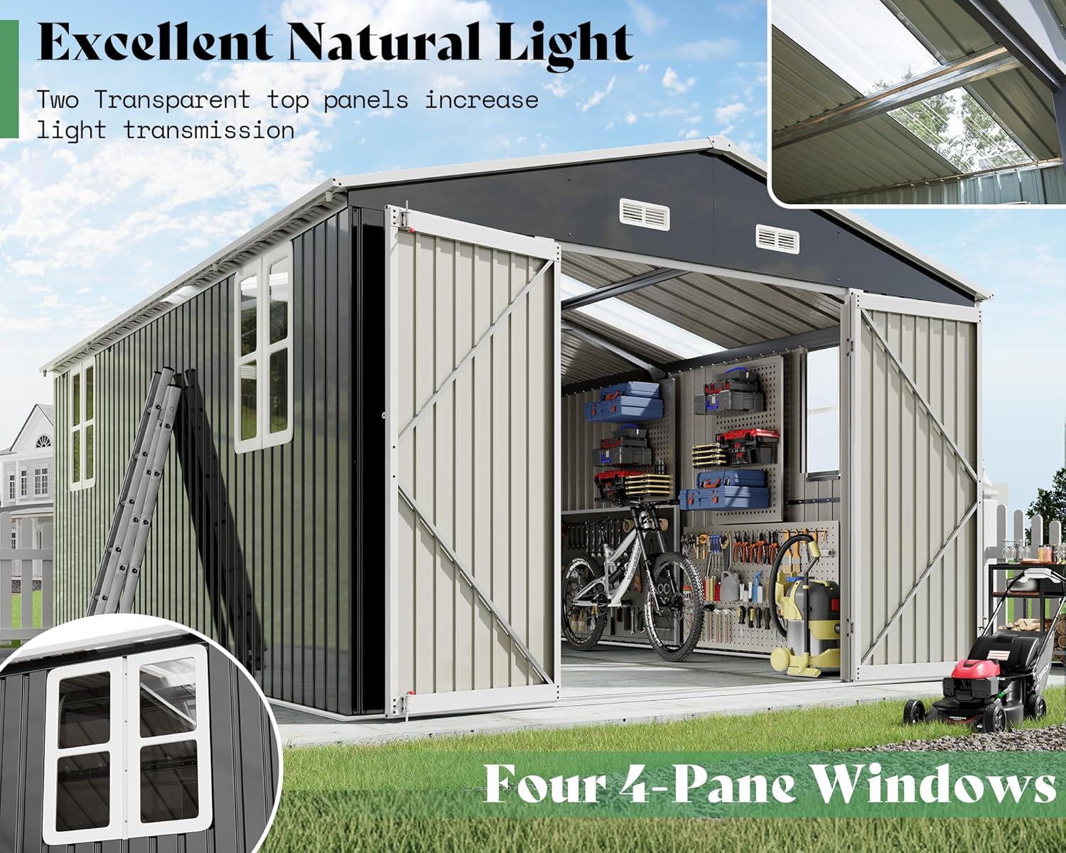 - Excellent Natural Light: The shed equipped with 2 transparent panels and 4 4-Pane windows, ensuring a well-illuminated interior. You can DIY the location of them to your liking