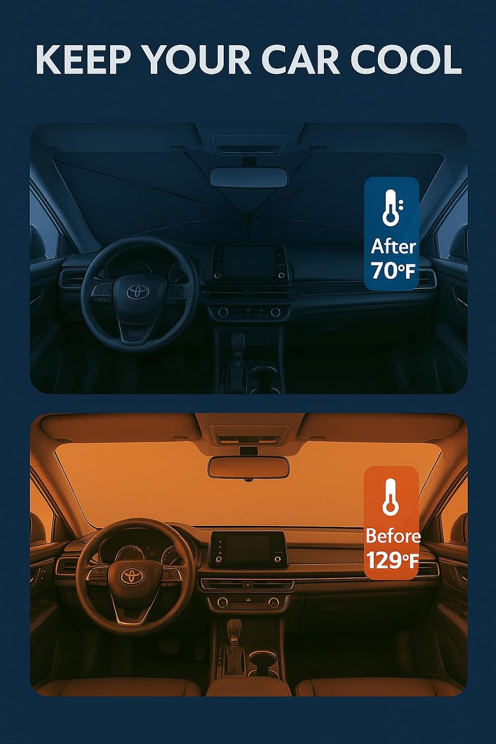 - Innovative Ice Crystal Material: The sunshade adopts a 4-layer design, which is thick enough to effectively block and reflect sunlight. After multiple uses, it is still strong and not easy to tear. The sunshade also uses innovative ice crystal materials to evenly distribute heat, quickly cool down, and keep your car cool all the time. You no longer have to worry about getting your seat or car handle scalded by high temperatures.