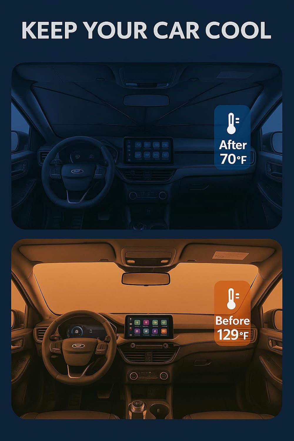 - Innovative Ice Crystal Material: The sunshade adopts a 4-layer design, which is thick enough to effectively block and reflect sunlight. After multiple uses, it is still strong and not easy to tear. The sunshade also uses innovative ice crystal materials to evenly distribute heat, quickly cool down, and keep your car cool all the time. You no longer have to worry about getting your seat or car handle scalded by high temperatures.