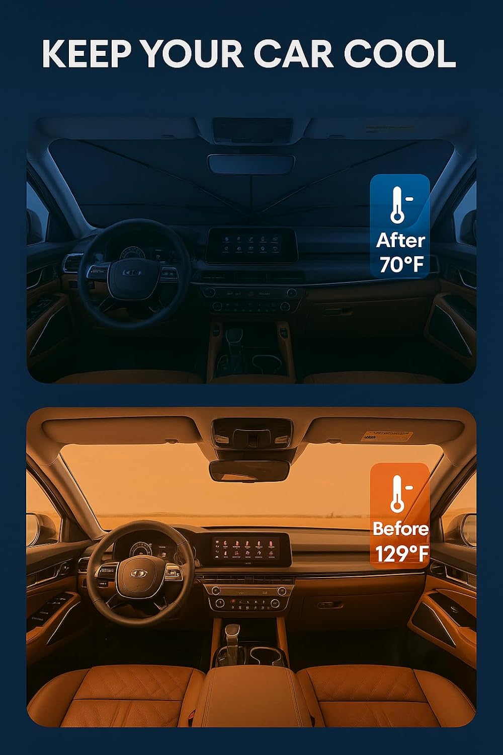 - Certified Sustainable. Customized Windshield Sunshade: Specially designed for the 2020-2025 Kia Telluride with precise mirror cutouts, providing 100% shading, carbon fiber handle, ensuring lightweight and durability while also having a fashionable feel. Our Telluride windshield sunshade can protect the interior of your car from various light damage and prevent dashboard and seat degradation.
