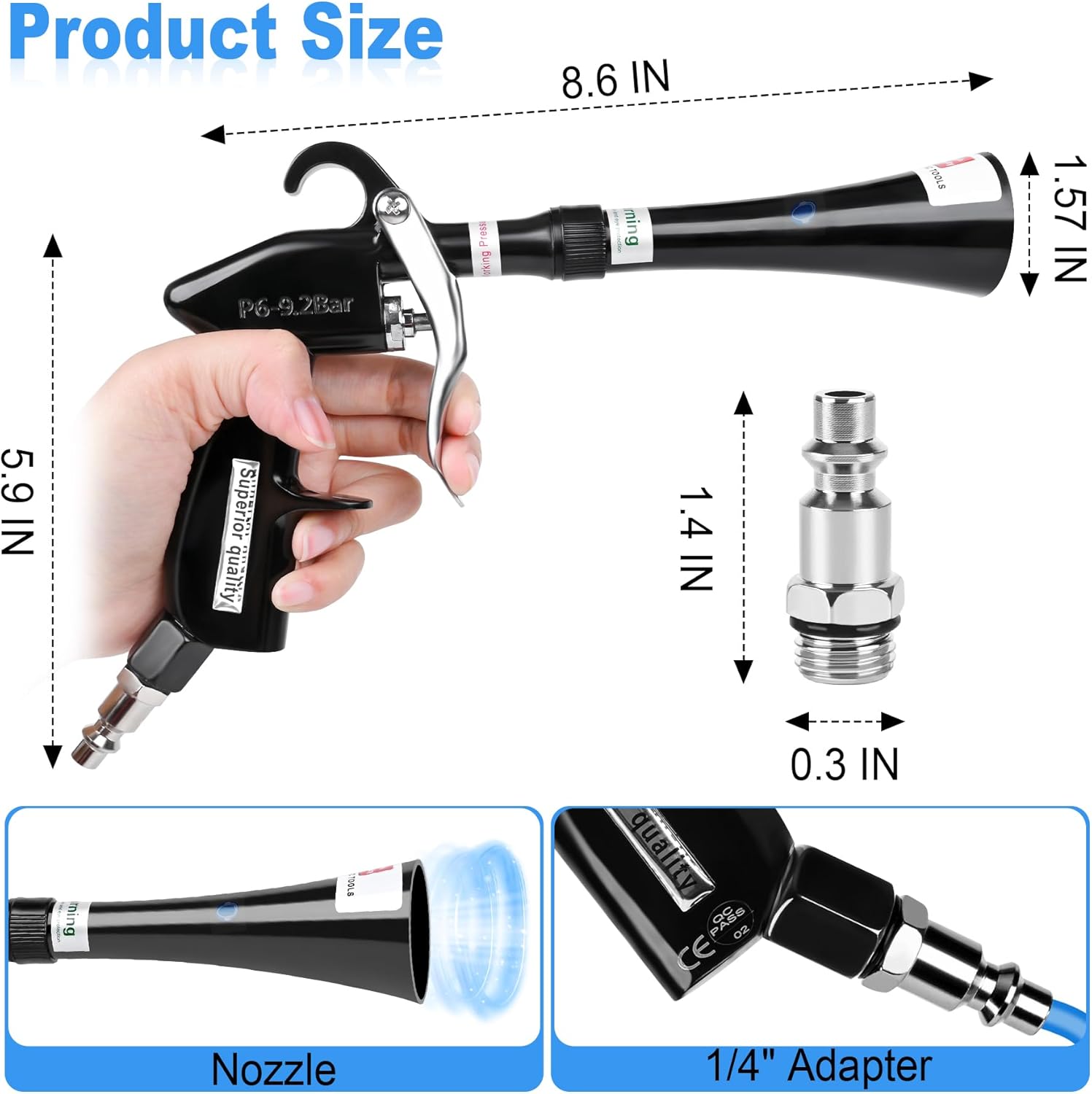 - 【Easy To Use】High car pressure cleaning tool needs to be used with an air compressor. Make sure air inlet adapter is sized for 1/4 IN. Connect adapter to air compressor and check pressure is in range of 6-9.2 bar/80-160 PSl. Keep air gun blower 1-10 cm away from objects to be cleaned. Stay away from children and do not point it at people when in use