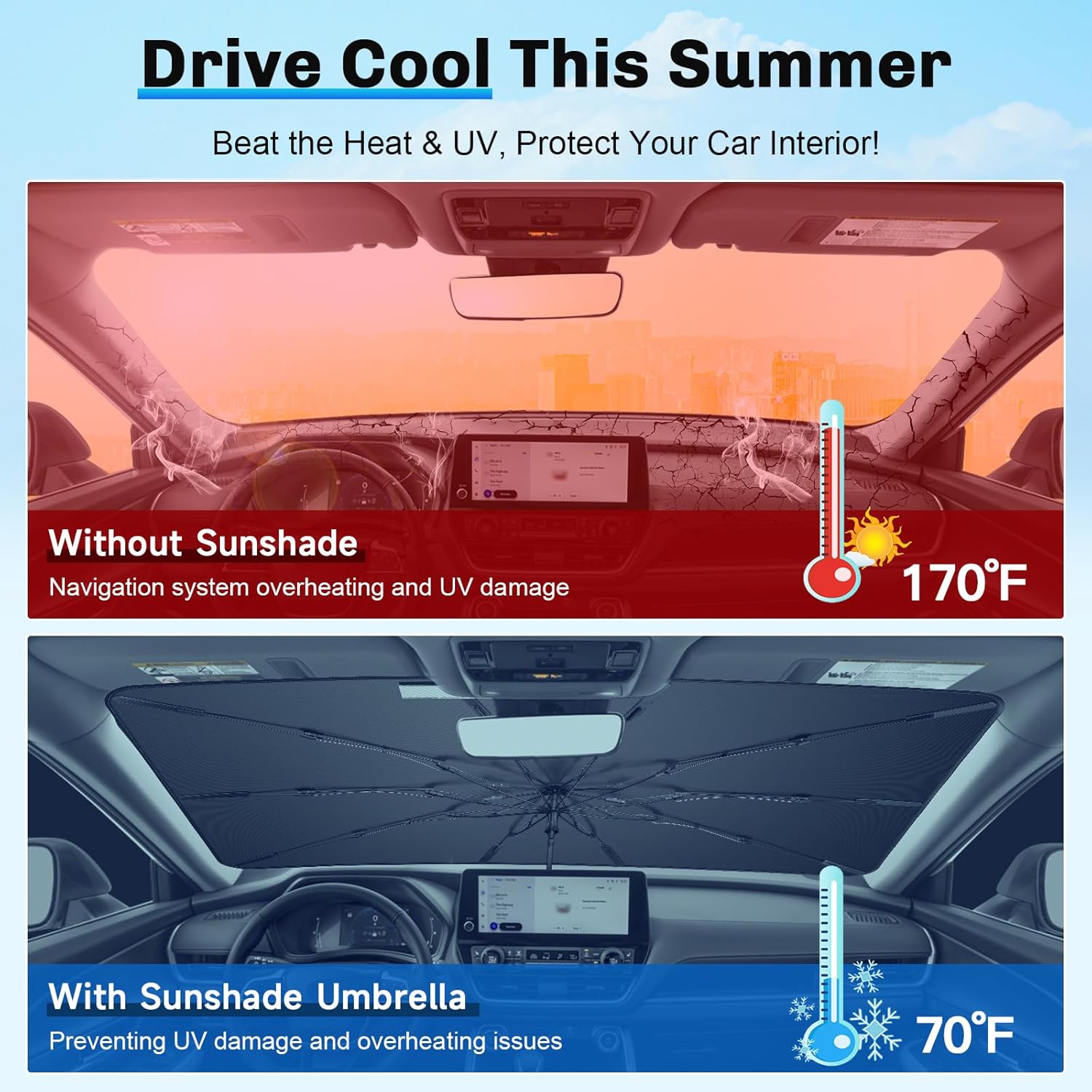 - 5. Portable & Universal Fit: Folding to umbrella size, easy to store and carry. Compatible with 2025 Grand Highlander /Equinox/Equinox EV/Santa Fe/Ioniq 5/Forester/Telluride/Ridgeline/Ranger/Tundra/Sierra/Silverado 1500/Wagoneer/Grand Wagoneer/Enclave, it provides adjustable coverage and adapts to most windshields, with slight adjustments for a better fit