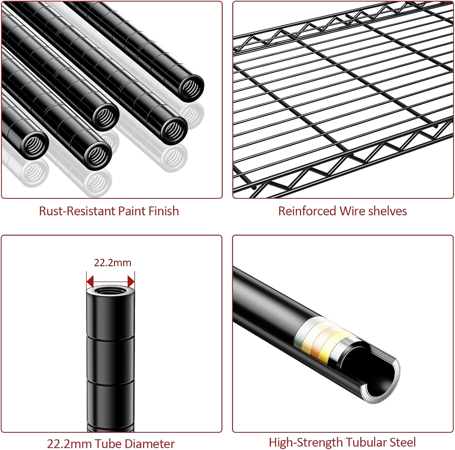 - 【Heavy-Duty Carbon Steel – Ultra-Stable Design】Built with premium carbon steel and 22.22mm reinforced pipes, this shelving rack is engineered for strength and durability. Each shelf supports up to 350 lbs, with a total capacity of 1750 lbs, offering solid support for your heavy tools, appliances, or storage bins.