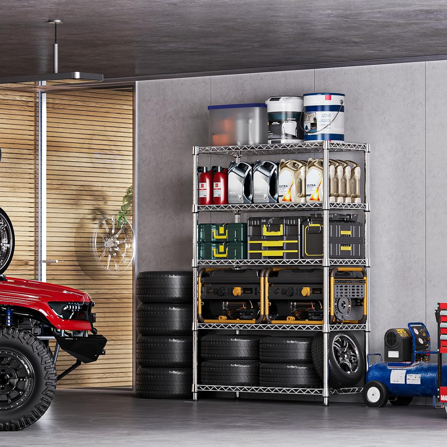 - 【Adjustable Shelves – Flexible for All Needs】Customize your storage your way. Each shelf can be easily adjusted in 1-inch increments to fit items of varying sizes—from bulky tools to compact kitchenware. This wire shelving unit adapts to your unique storage needs, creating a more organized and efficient space.