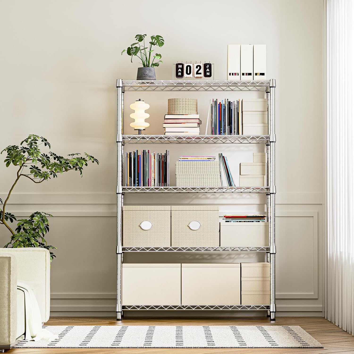 - 【Heavy-Duty Carbon Steel – Stable & Durable】Crafted from premium carbon steel and reinforced with robust 22.22mm diameter pipes, the MZG wire shelving unit (17.7"D x 47.2"W x 72.3"H) offers outstanding stability and durability. Each shelf can bear up to 350 lbs, with a total load capacity of 1750 lbs, making it perfect for heavy-duty storage in both home and commercial settings.