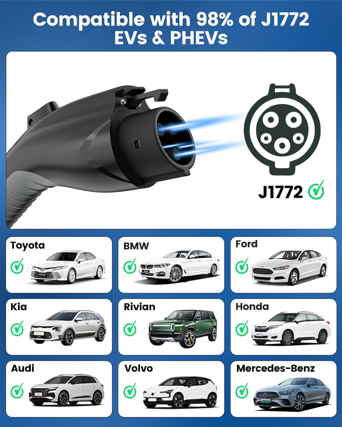 - 【SAE J1772 Connector – Widely EV Compatibility】SEGUMA J1772 charger is equipped with standard j1772 connector, it's widely compatible with J1772 electric vehicles like Ford Mustang Mach-E, Chevrolet Bolt, Nissan LEAF, Hyundai Kona EV, Audi e-tron, and all J1772-equipped EVs. Tesla vehicles require SAE J1772 to tesla adapter (sold separately)