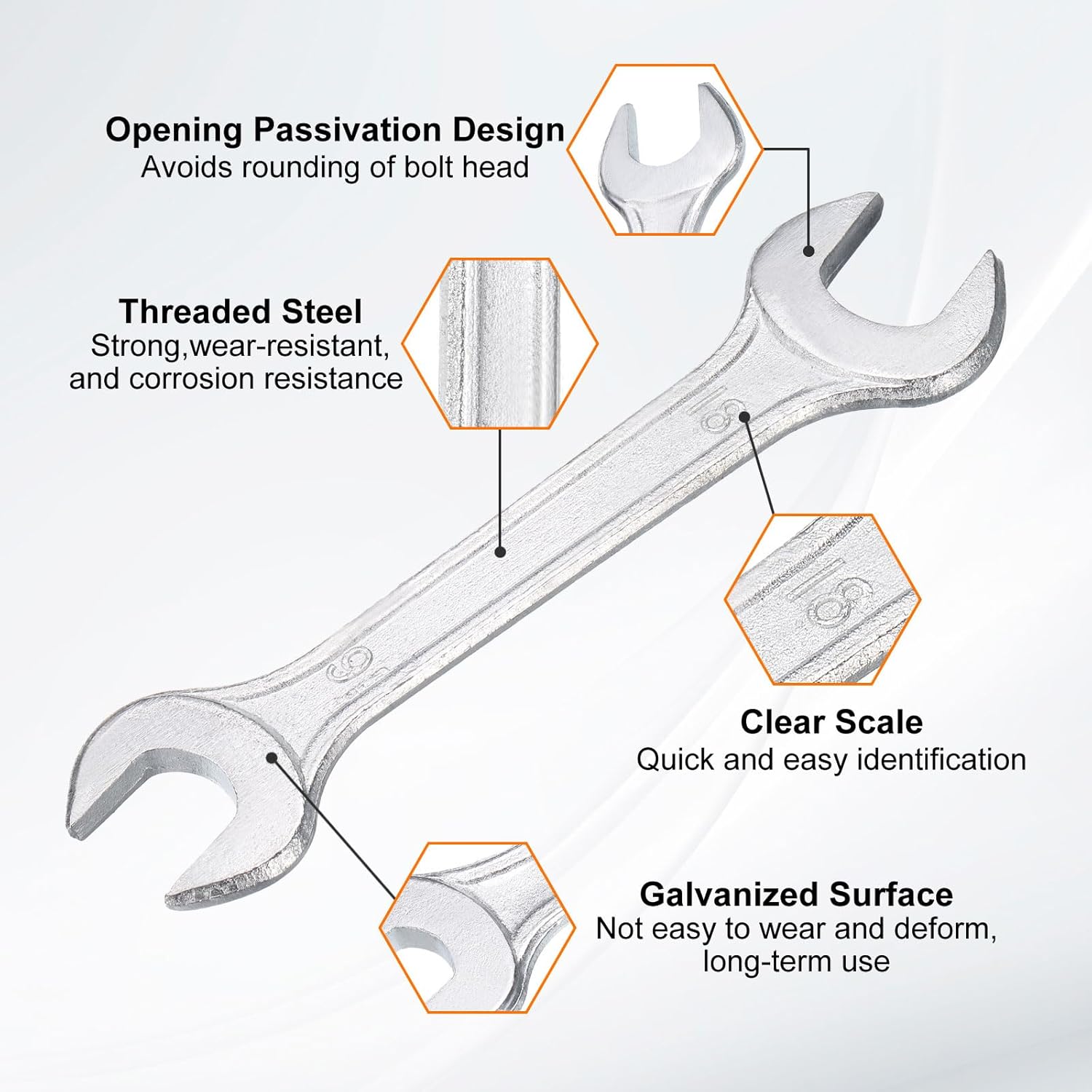 - Material - Our double open-end wrench is made of threaded steel with high hardness and excellent wear resistance. The surface galvanizing improves its wear resistance, keeps its surface smooth and reduces wear, is not easy to deform, and can be used for a long time.