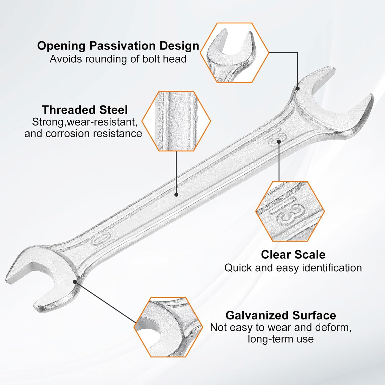 - Material - Our double open-end wrench is made of threaded steel with high hardness and excellent wear resistance. The surface galvanizing improves its wear resistance, keeps its surface smooth and reduces wear, is not easy to deform, and can be used for a long time.