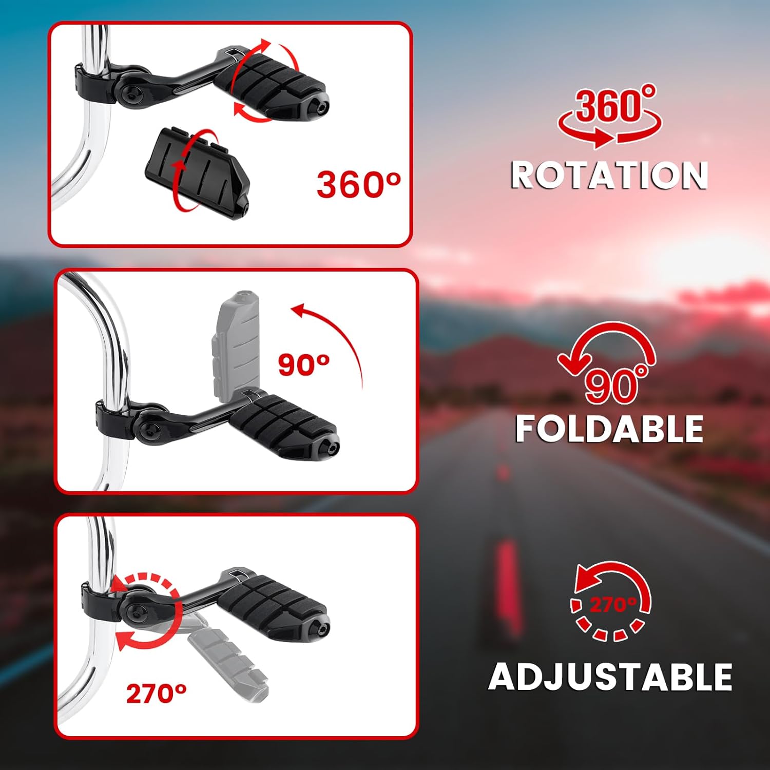 - Adjustable: Retractable highway pegs can 360° rotation, it's convenient for you to adjust the angle according to their needs. 270° Adjustable allows to up or down adjustment. 90° foldable allows to retract the footpeg by folding it upward 90°