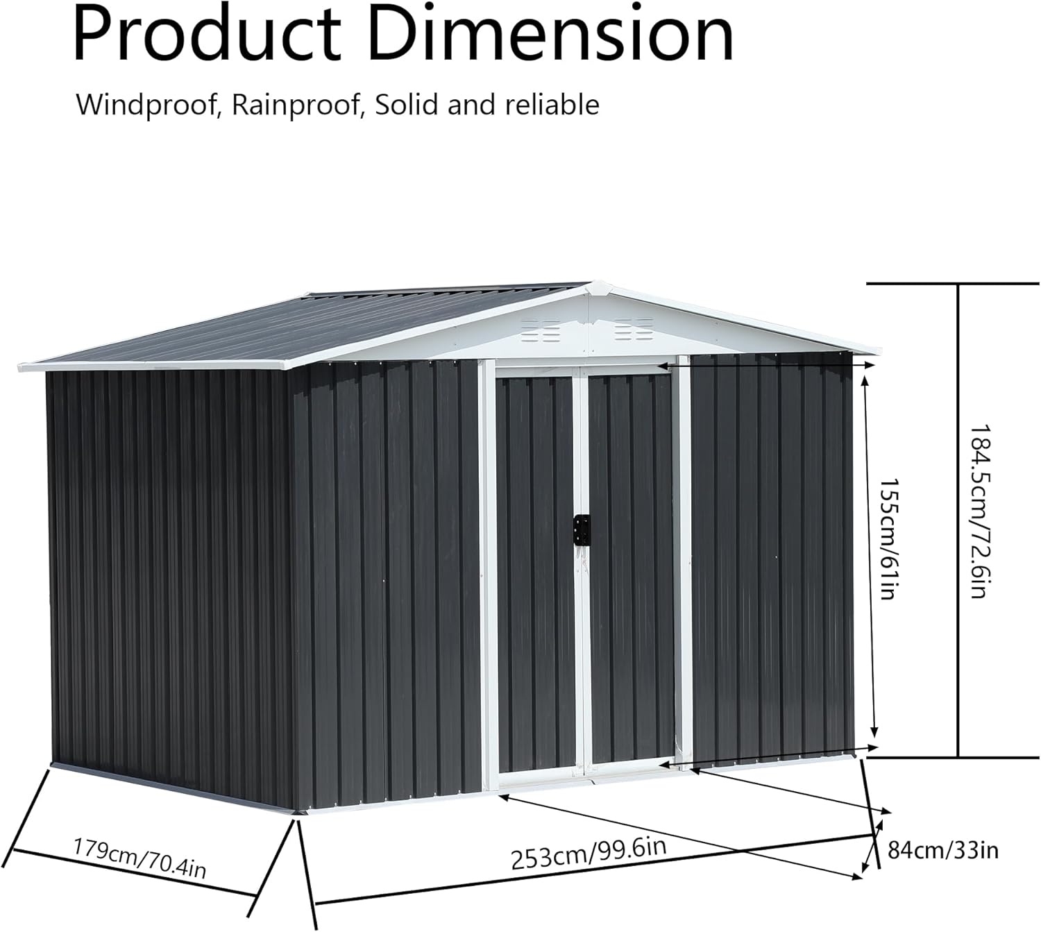 - ๐ก๐๐ฅ๐ฅ-๐ฐ๐๐๐ญ๐ก๐๐ซ ๐๐ญ๐จ๐ซ๐๐ ๐ ๐๐ก๐๐: Our metal shed 6x8 features smooth, lockable sliding doors with handles for easy opening and closing. It serves not only as a safe space for storing garden tools but also as a warm pet house. The sloped roof of the storage building effectively prevents leaks and snow accumulation, while the four integrated punched vents improve airflow, helping to keep your items dry