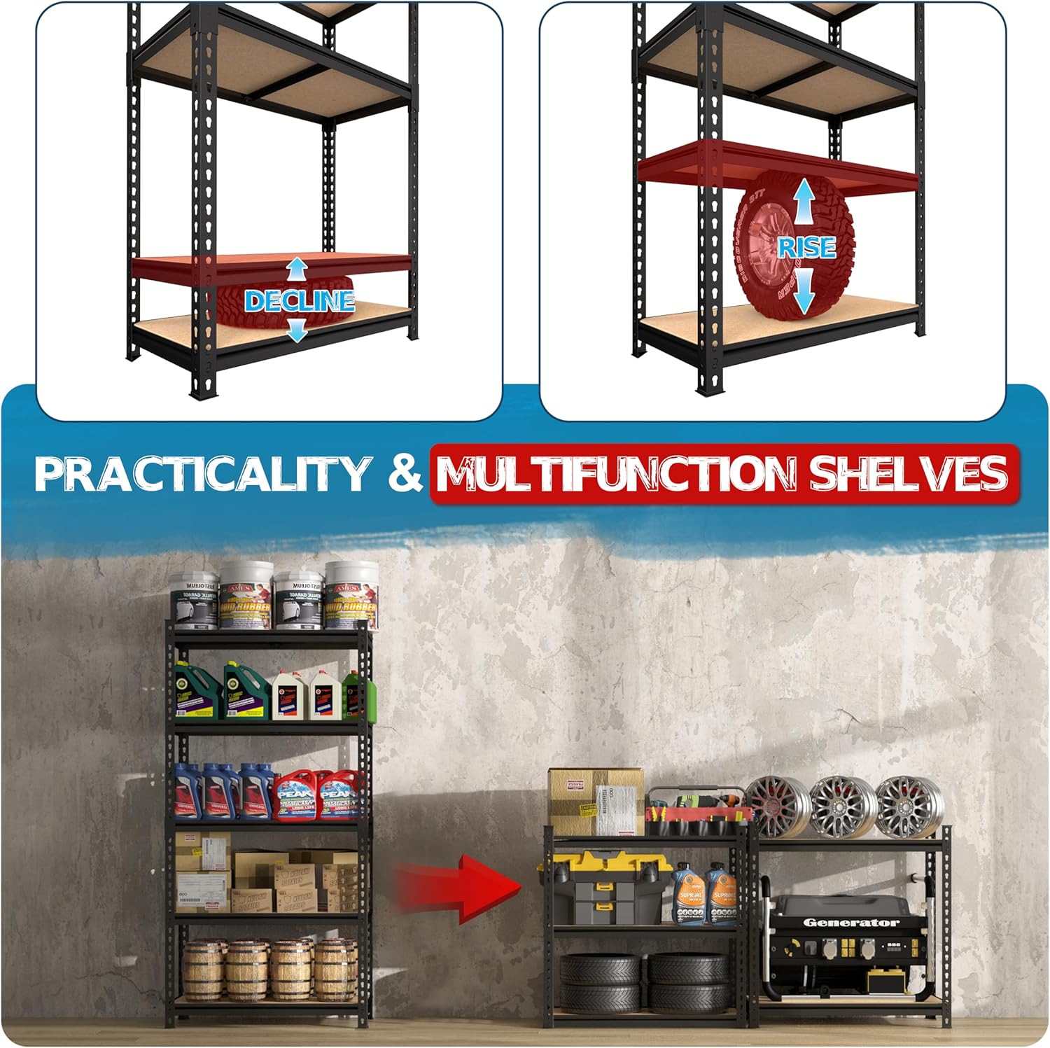 - Adjustable Shelves: These garage storage shelves are made of high-quality thick MDF boards and thicken metal steel frame with black powder coating. It is customizable with 1.58" increments to fit short and tall items.