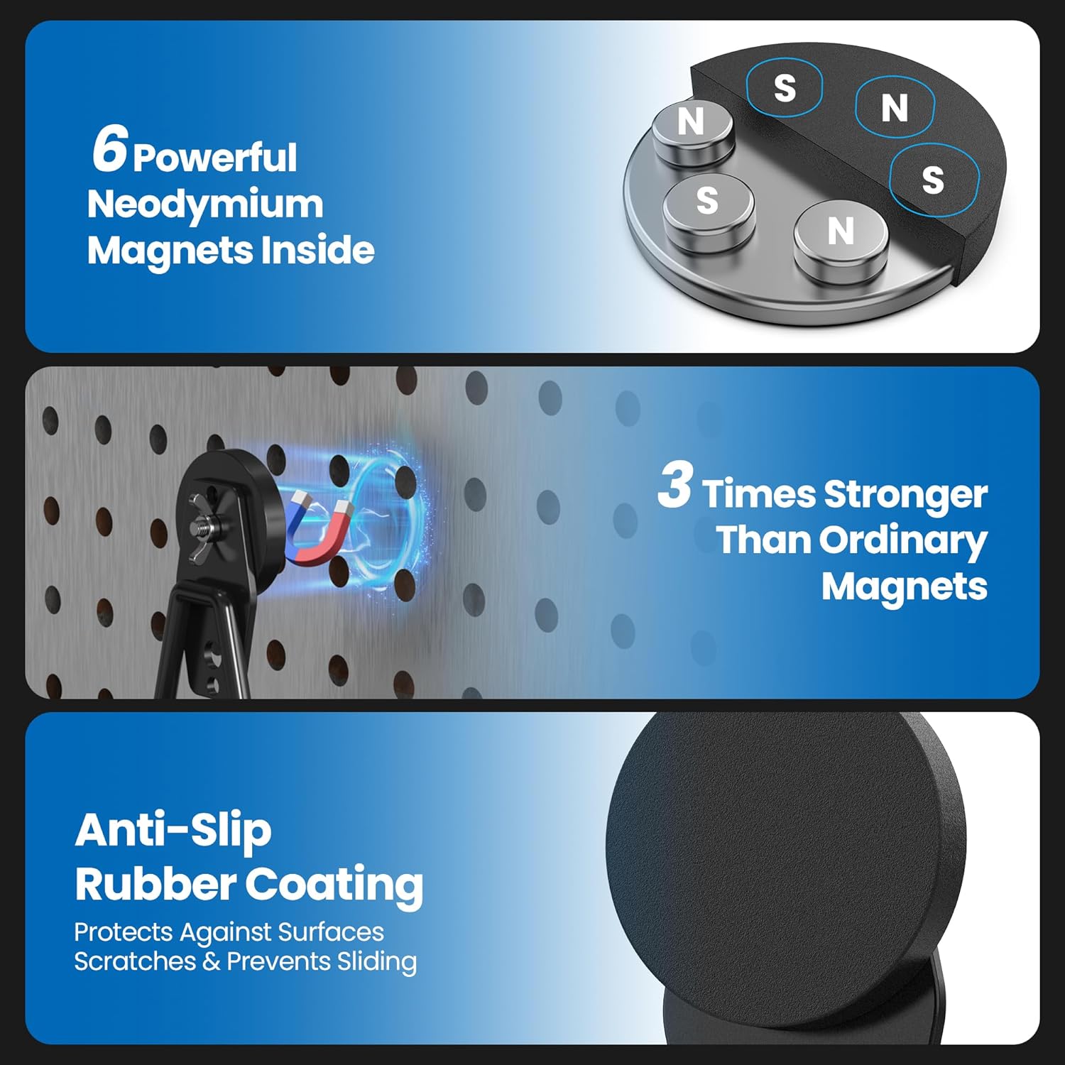 - 【Anti-Slip & Anti-Scratch Coating】 The industrial magnet base and double hooks are covered with durable rubber/PVC coating (high friction coefficient) that enhances grip to prevent slipping, protects surfaces (like metal cabinets, shelves, van, and pegboards) from scratches or marring, and resists rust and corrosion—suitable for both indoor and outdoor use