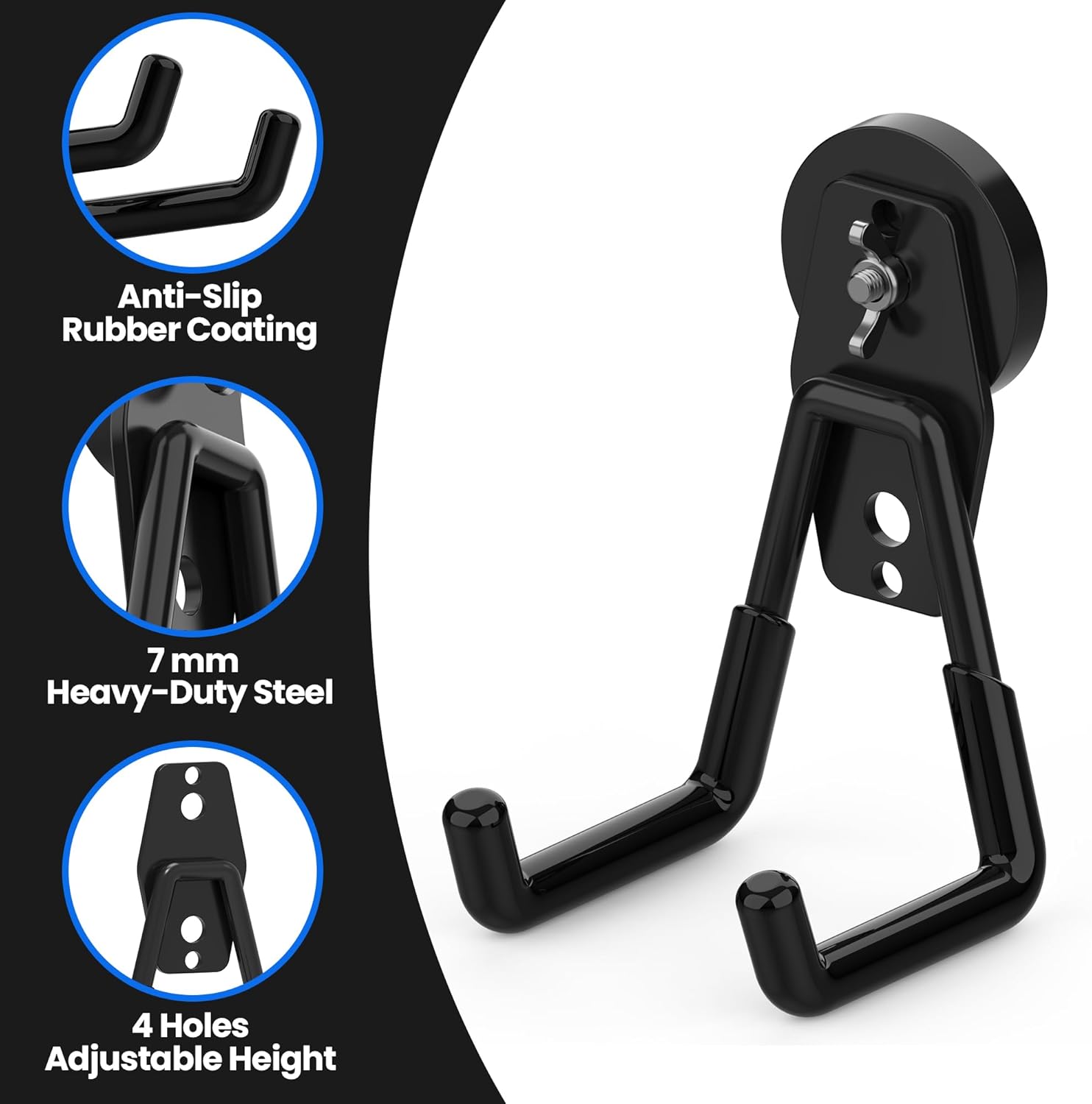- 【Super Strong Magnetism & Sturdy Structure】 Each magnet hooks heavy duty features magnet base embedded with 6 industrial-grade rare earth neodymium magnets, ensuring powerful adsorption and reliable load-bearing. Made of thick, high-quality steel, these magnetic tool hooks provide a stable hold for heavy tools like power drills, hammer, air tools, shovels, rakes, ladders, toolboxes, toolchests, wrenches, tool carts, as well as daily items such as brooms, mops, dustpans, hoses, gym bags, backpacks, kitchen utensils, dog leashes, wires, straps, ropes, extension cords, clothes, and wreaths.