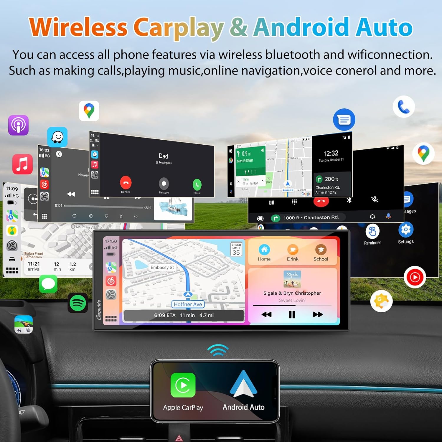 - 【 Real-time Maps Navigation】Experience real-time GPS navigation on the CARPURIDE Apple CarPlay screen, which magnifies map details for better visibility. Utilize popular apps like Google Maps and Waze directly from your car's dashboard, ensuring you're always on the right path without the need for constant updates. Plus, the 11.26-inch HD IPS display offers a clear and intuitive view, enhancing your driving experience.