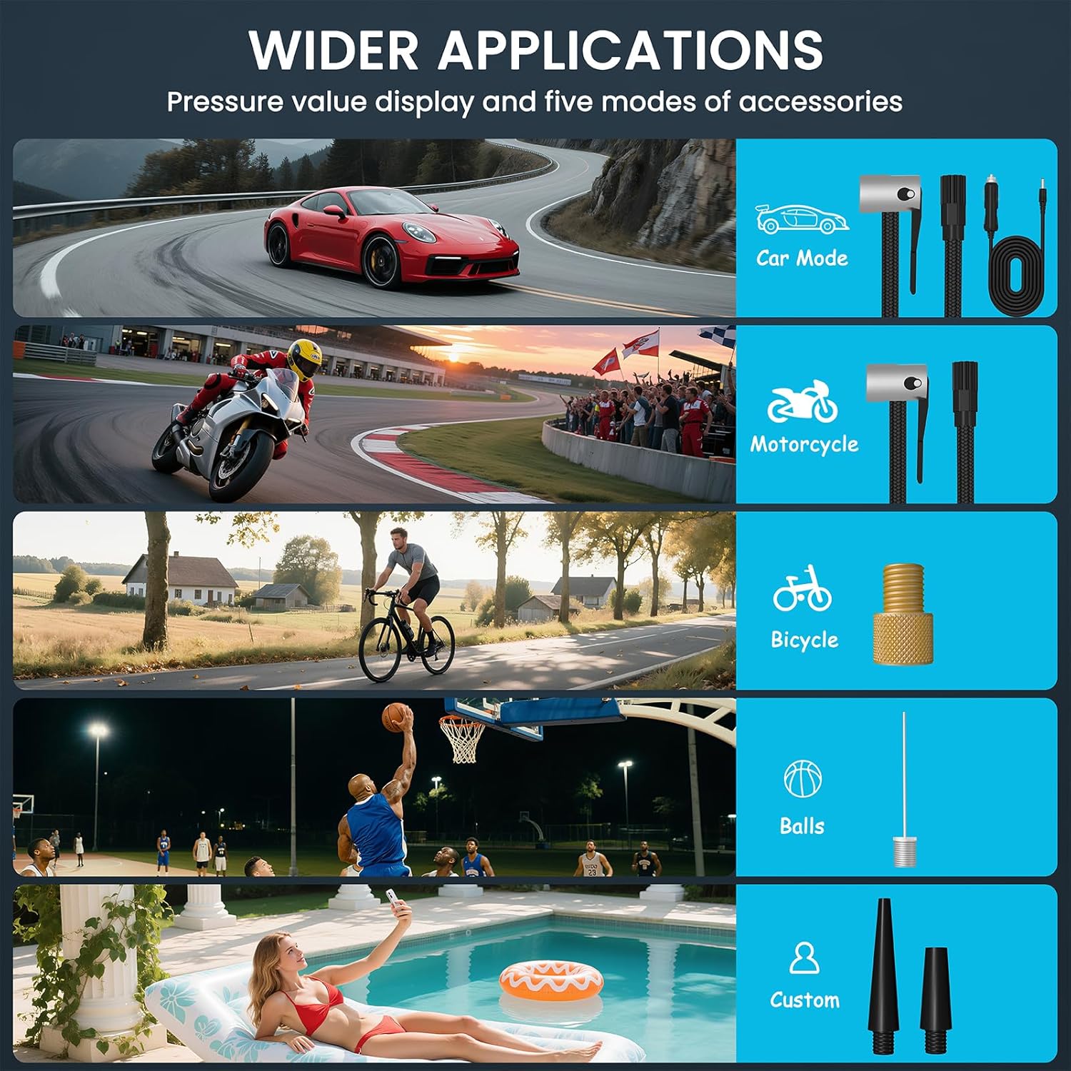 - Versatile 4-in-1 Inflation: Tackle multiple tasks effortlessly with dedicated, optimized modes for Cars, Motorcycles, Bicycles, and Basketballs/balls. One tool handles your essential inflation needs.