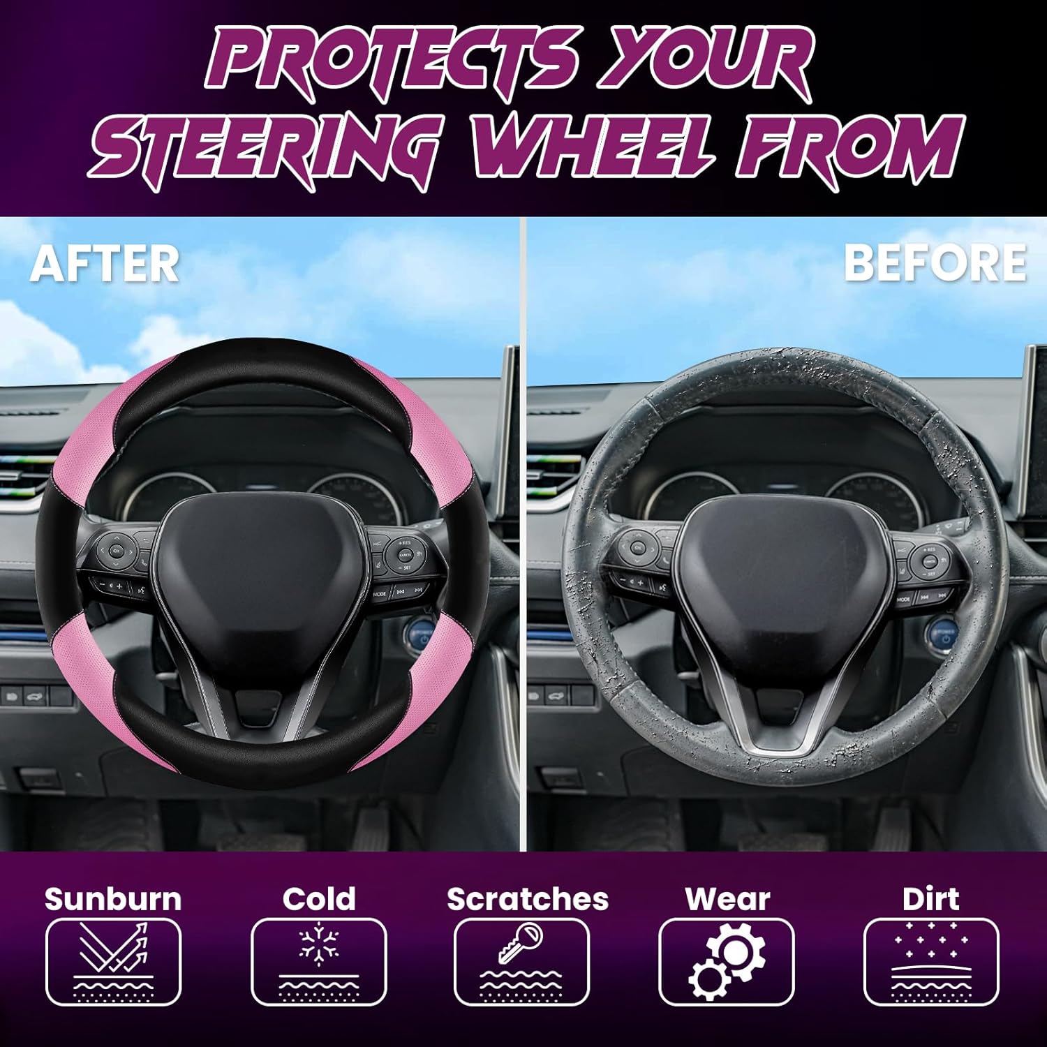 - ADD A PROTECTIVE LAYER TO YOUR STEERING WHEEL:Shield your steering wheel with UV-blocking technology, scratch-resistant surface, and wear reduction—all while maintaining buttery-soft tactile comfort for smooth driving control.