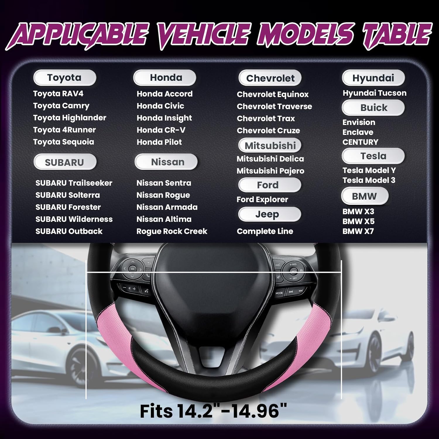 - FITS VARIOUS CAR MODELS :Perfectly compatible with Ford, Toyota, Tesla, Honda, Nissan, Chevrolet, Buick, Subaru,Volvo, BMW, Wrangler, Jeep, Hyundai, Mitsubishi 14.2-14.96 inch round steering wheel.