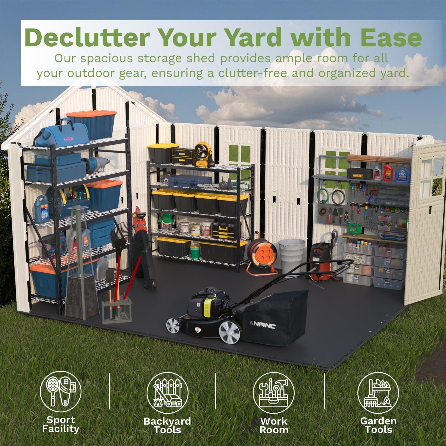 - Resistant Durability: Built as a heavy-duty resin shed, this structure uses recyclable double-layer polypropylene resin with dual UV protection to combat sun damage. The spire-shaped roof prevents water pooling, ensuring resilience in extreme weather.