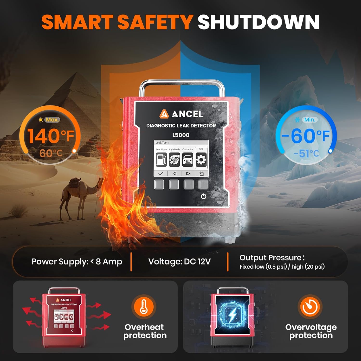 - 3 Modes, Detect Any Leak Like a Pro: Tackle any leak with ease! ANCEL L5000 smoke machine automotive offers Low (0.5 PSI), High (20.3 PSI), and Custom Pressure modes (0.4–20 PSI), perfect for diagnosing EVAP, turbo, fuel, EGR, crankcase, intake, exhaust, and cooling systems. From sunroofs and window seals to cabin leaks and tiny hose cracks, no suspicious leak goes unnoticed. Experience the confidence of accurate leak detection, so you can fix problems right the first time