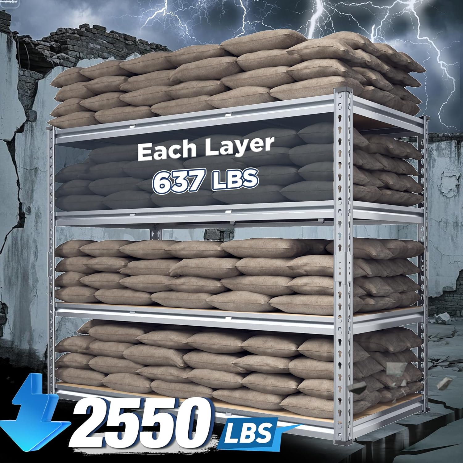 - 【Garage Shelving - 2550LBS Capacity】REIBII garage shelves are built like a tank! Thick steel legs and chunky boards can carry 637lbs on each shelf – that's 2550lbs total! Suit for stacking toolboxes, car parts, or even your camping gear. No wobbling, no bending, just rock-solid storage