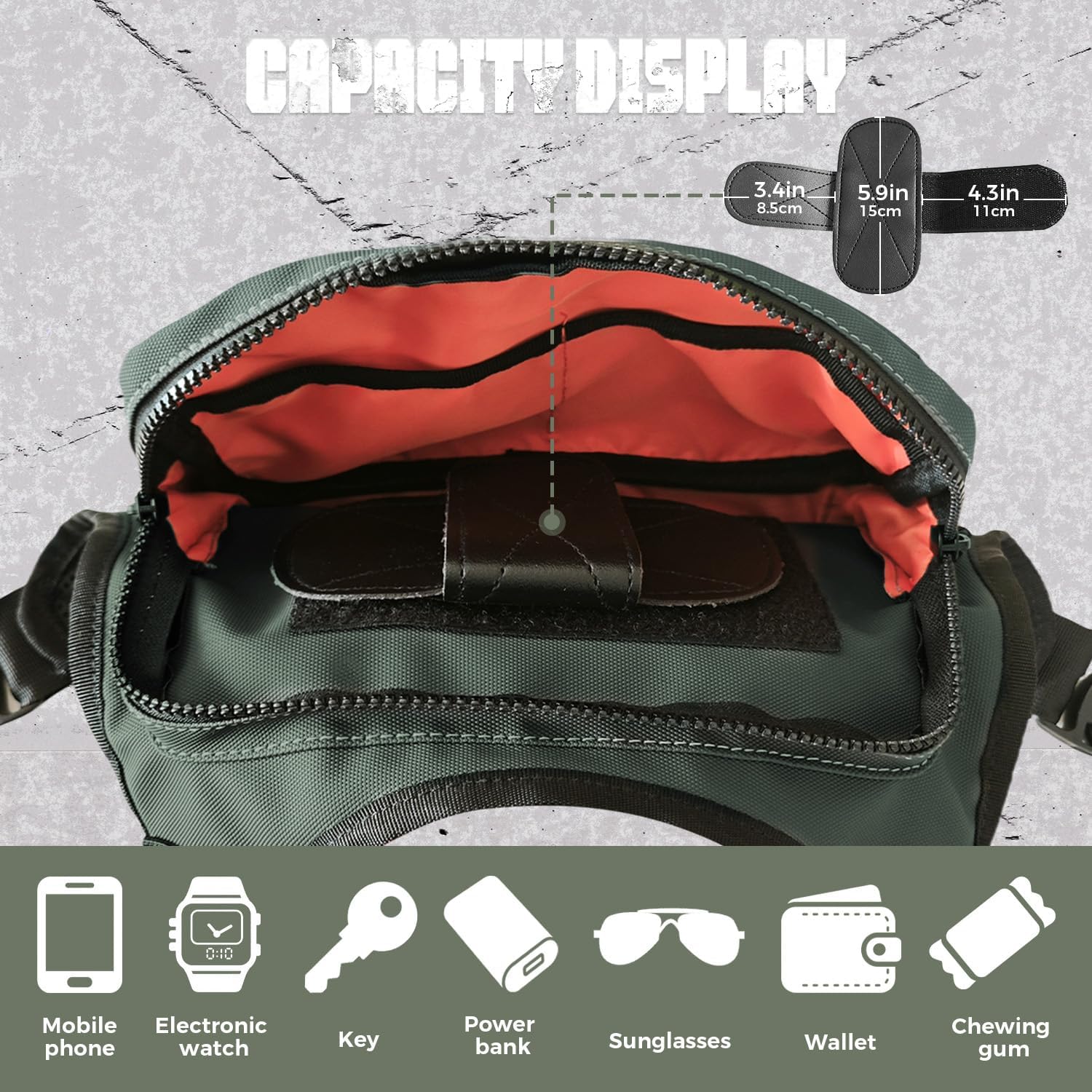 • 5) The front zipper pocket is large enough to hold all your essentials while working out, cell phones, radio, backup power bank, wallet, cards, passport, gloves, keys, flashlights, pens, notebook, torches, sun glasses, earphone, binocular, emegency gears, etc.