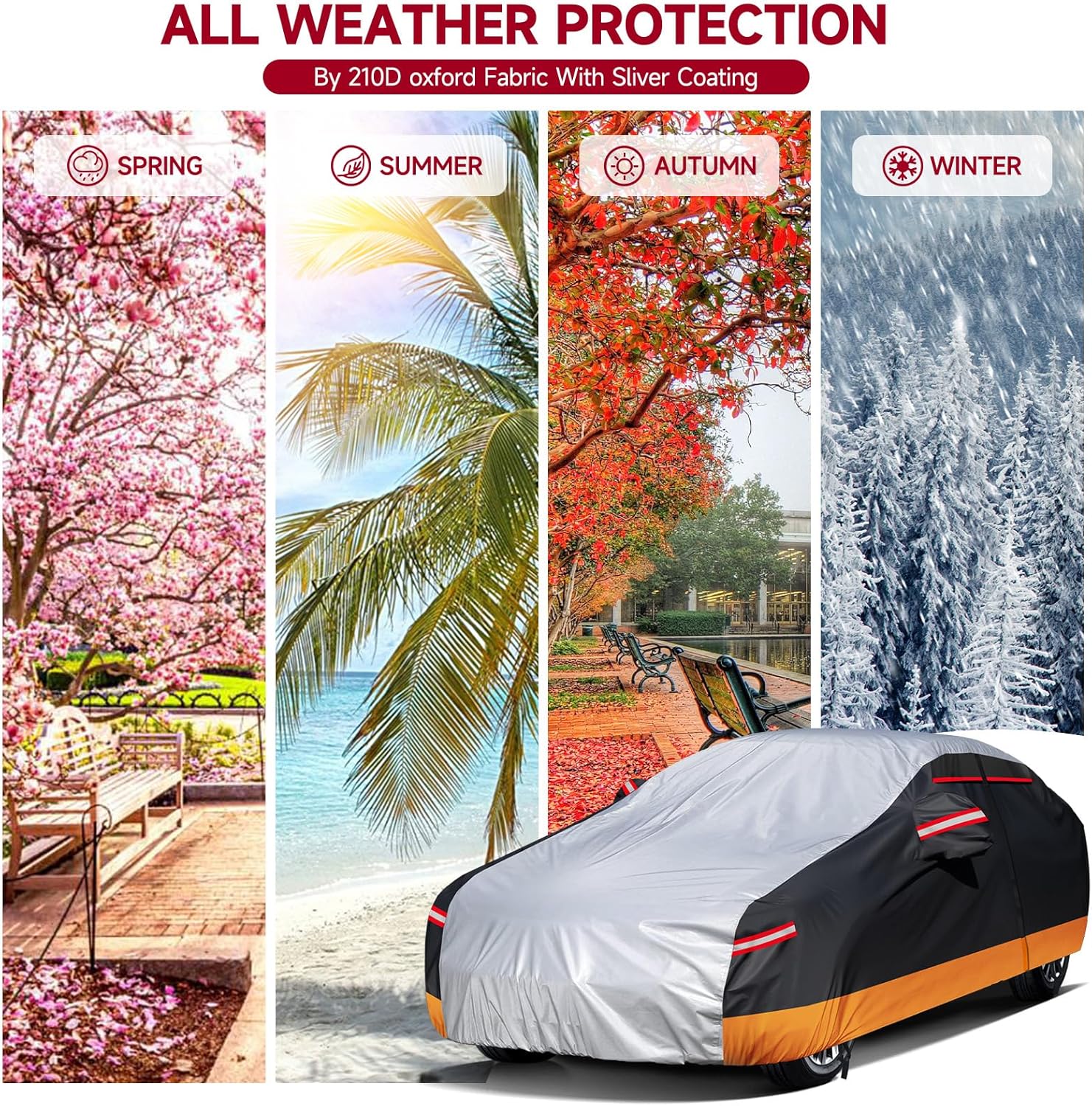 - ULTIMATE All-WEATHER PROTECTION:Waterproof 5000pa,silver coating better reflects harmful UV rays Full car cover sun protection keeps car hood, motor, doors, windows and trunk safe from, wind, rain, snow and other damage. Dust/stain protection-suitable for all seasons (spring, summer, autumn, winter)