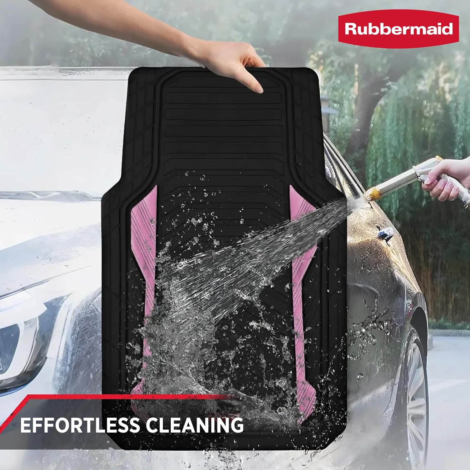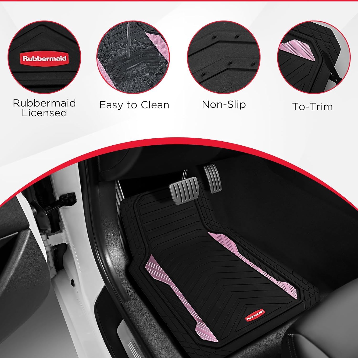 Rubbermaid Car Floor Mat, Heavy Duty All-Weather Car Mats Full Set with Dual-Tone Pink Aluminum Inserts – Universal Fit, Anti-Slip Backing, Trim-to-Fit for Most SUV, Sedan, Van