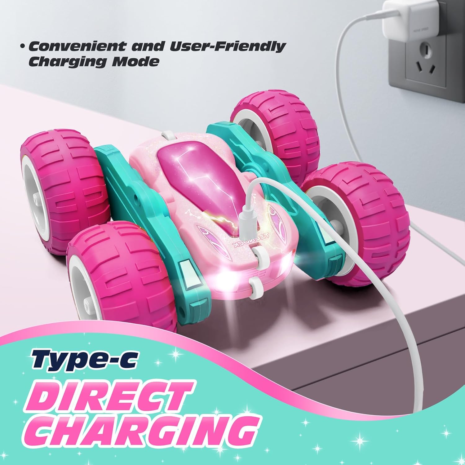 Tecnock Pink Remote Control Car for Girls and Boys, 2.4GHz RC Cars with USB-C Easy Charging, 4WD Double Sided 360° Rotates and Flips RC Stunt Car, Toys Gift for Kids