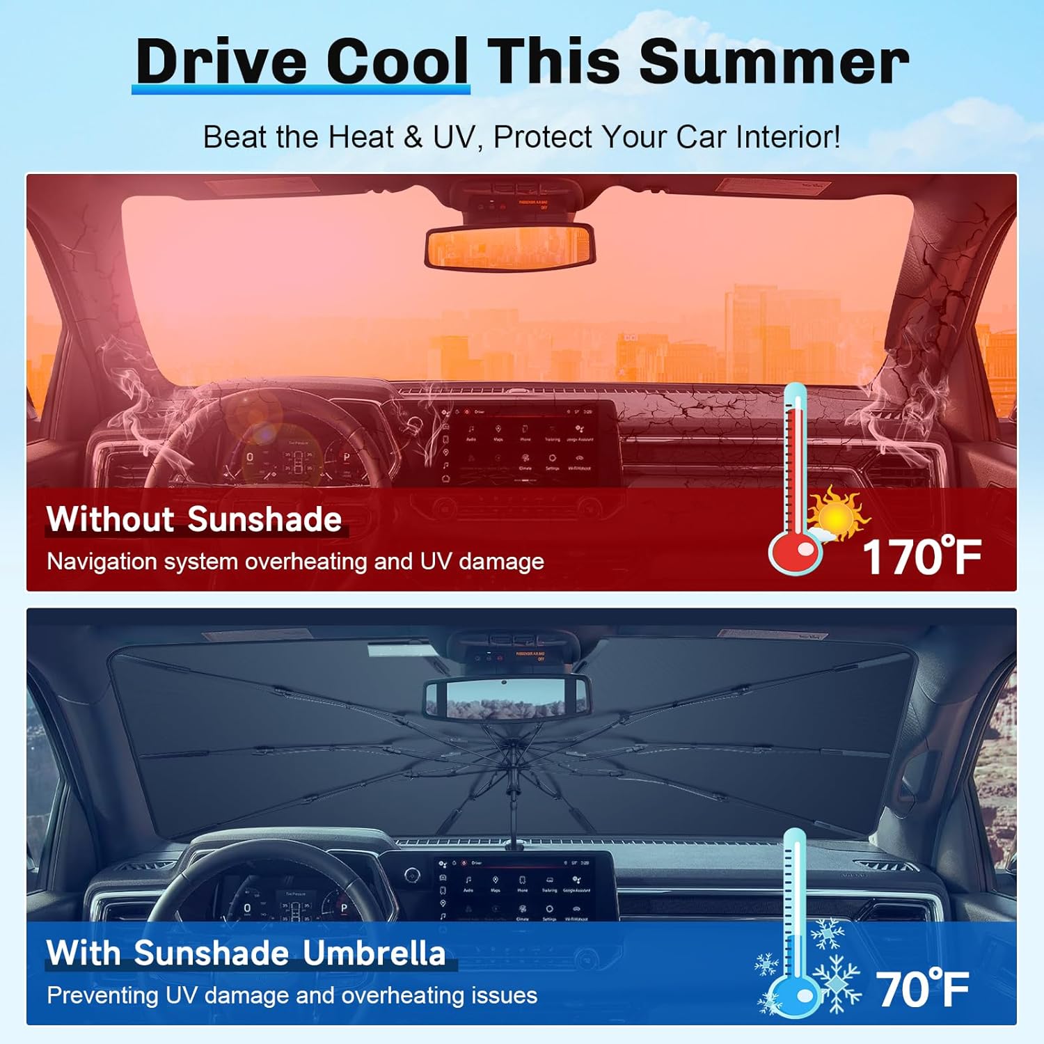- 5. Portable & Universal Fit: Folding to umbrella size, easy to store and carry. Compatible with 2025 Land Cruiser/Tacoma/R1T/R1S/Colorado/Canyon/Yukon/Defender/Accord/Armada/Polestar 2/QX80, it provides adjustable coverage and adapts to most windshields, with slight adjustments for a better fit