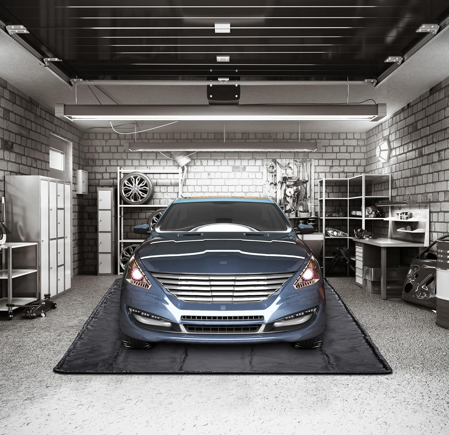 - Ultra-Durable & Non-Slip Surface:Made from 18 oz. reinforced PVC tarpaulin, this garage mat is tear-resistant and built to last. The textured non-slip surface ensures your car stays in place, while the cushioned base protects your garage floor from damage.