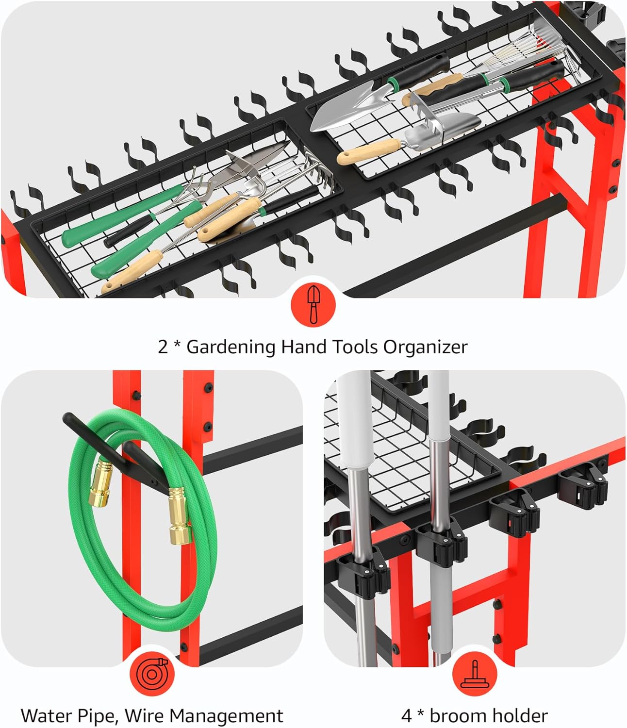 CCCEI Garage Organization with Wheels, Outdoor Gargen Yard Shed Tools Organizer Cart, Home Storage for Cleaning Supplies, Broom Holder, for Shovel and Rake, Long Farming and Farming Tools, Red.
