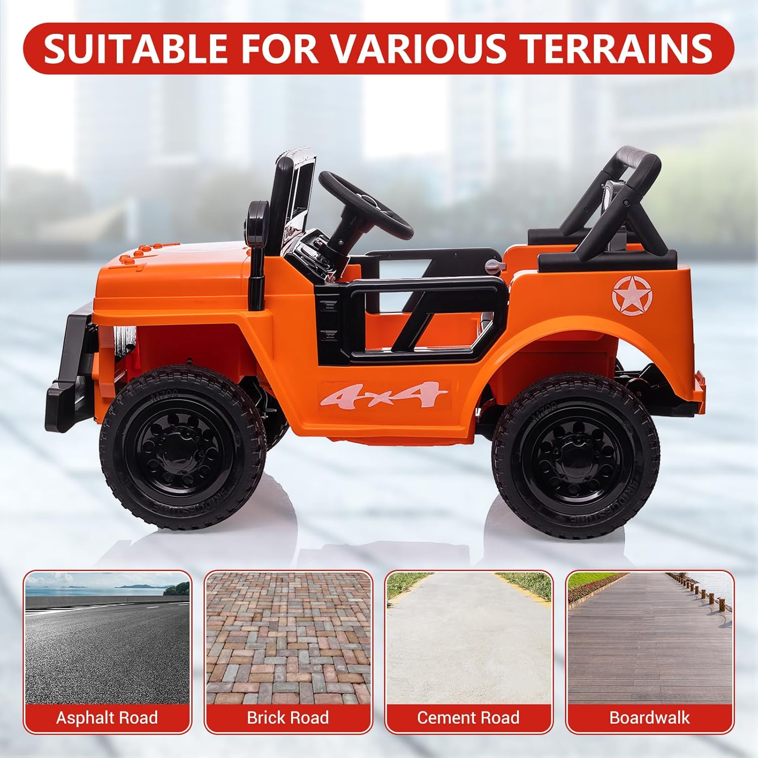 - 4. Growth-Focused Adventure Platform: 40.4"x25.2" cockpit (102.6x64x59.4cm) with ergonomic seating for kids. Develops spatial awareness and pedal coordination through terrain navigation. Retail-ready packaging includes charging adapter and decal kit.