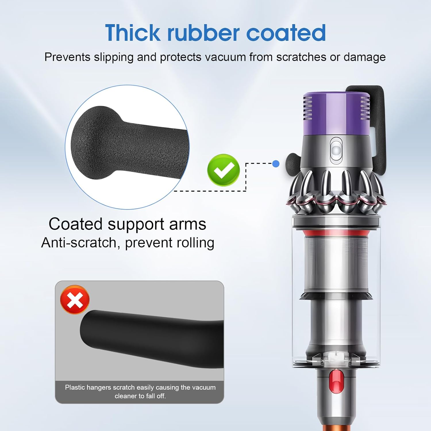 - Heavy-Duty & Secure Hold – Made of solid metal with thick rubber-coated support arms to prevent slipping and protect your vacuum from scratches or damage.
