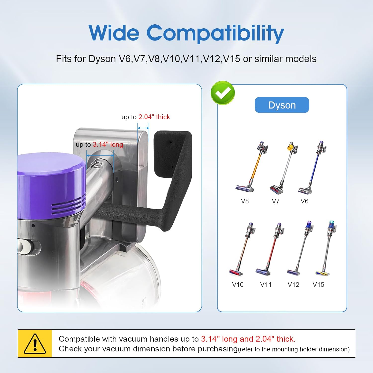 - Wide Compatibility with Shark Cordless Models – Fits for Shark UltraCyclone Pet Pro+ IZ363HT, IZ362H, IZ361H, IZ462H, IZ483H, IX141, IX140 ,Dyson V6,V7,V8,V10,V11,V12,V15 or similar models. PLEASE NOTE that Compatible with vacuum handles up to 3.14" long and 2.04" thick.check your vacuum dimension before purchasing(refer to the mounting holder dimension )