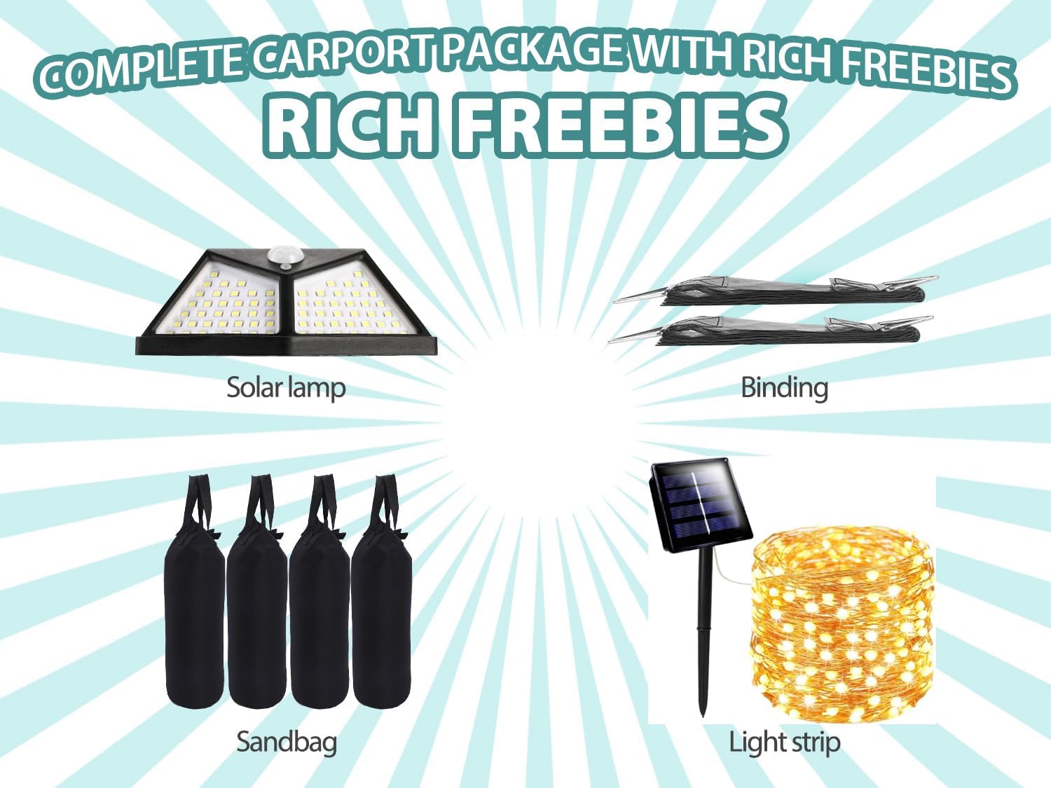 - 【Great Value Package】: This car port offers excellent value with high-quality materials and added bonuses like solar lights, a light belt, bindings, and windproof sandbags—all included with your purchase.