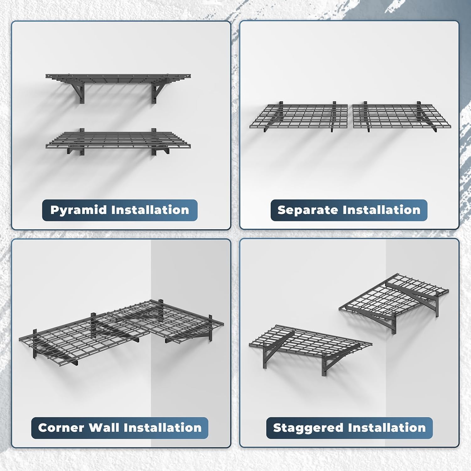 - 🏆【Heavy-Duty Load Capacity】- Jusgym garage shelving wall mounted system is engineered with premium steel, offering exceptional strength. Each 2x3ft bracket holds up to 250 lbs, and with 2 shelves totaling 500lbs capacity, it effortlessly stores bulky items like tools, tires, and heavy storage bins. Built to last, even under extreme weight!
