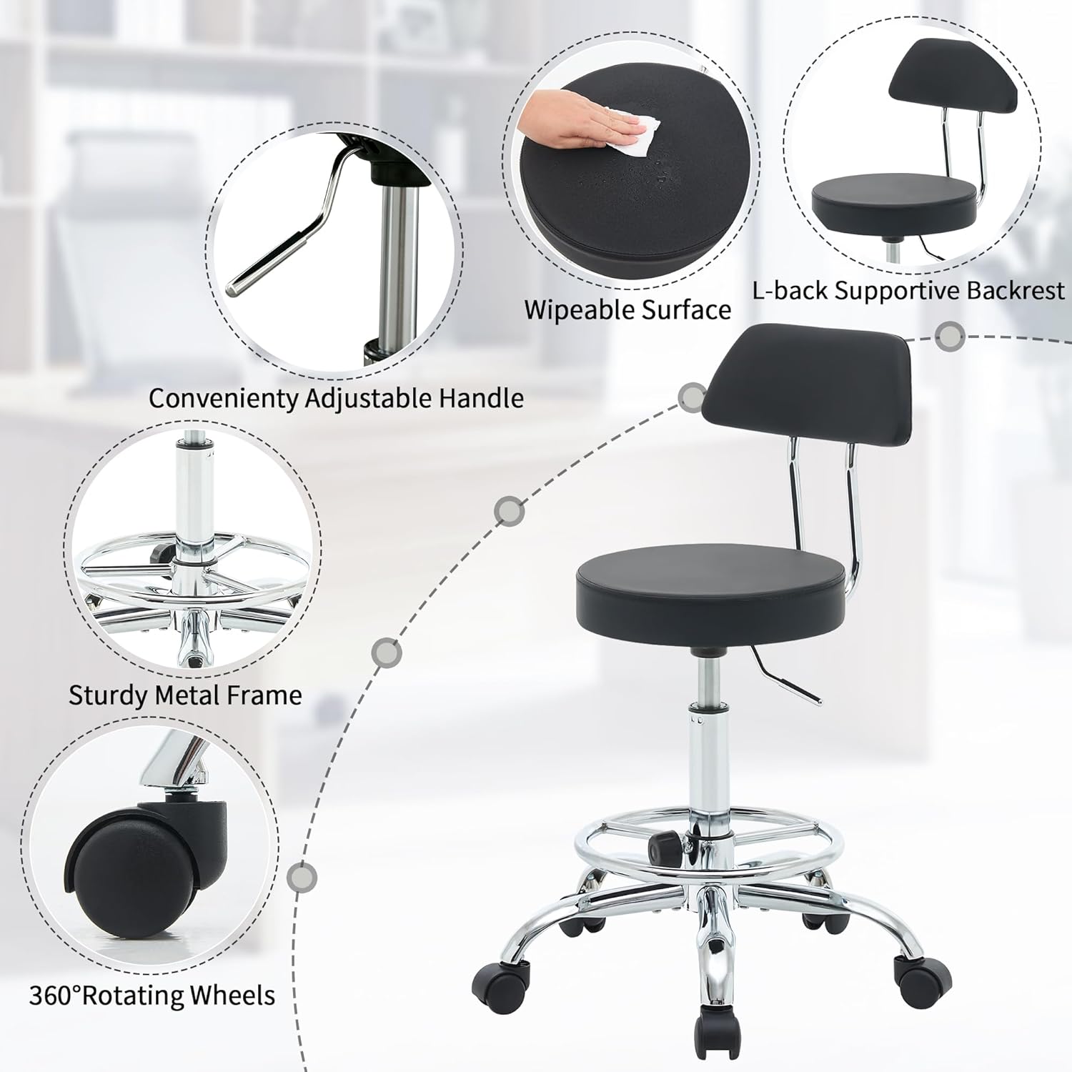 Office Chair with Back (Adjustable Height Posture Stool 19.5’’-26.6’’)(Drafting Chair on Wheels) Work Stool with Footrest (Black)