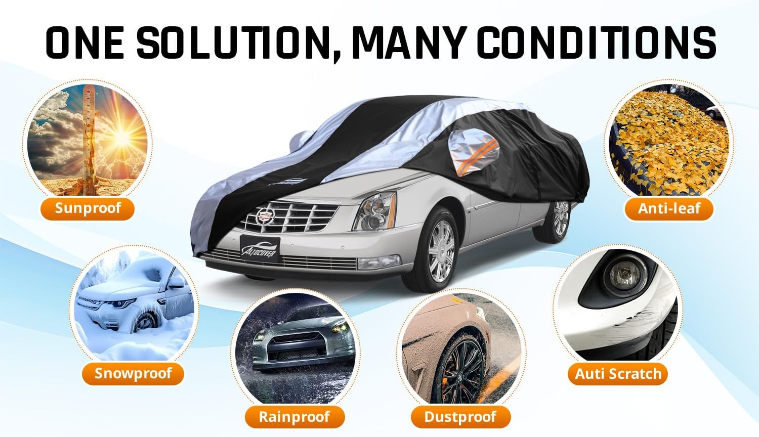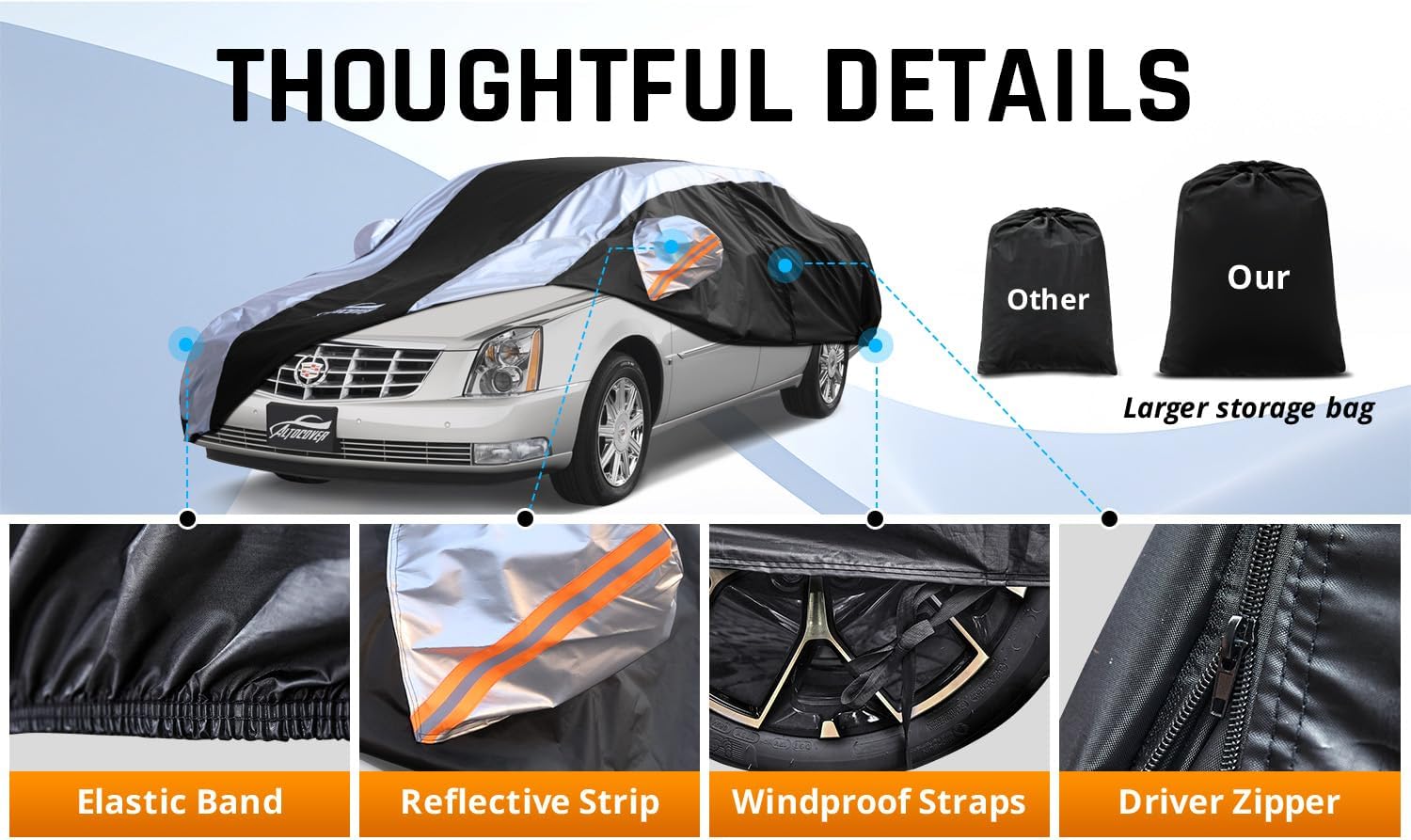 Car Cover Waterproof All Weather with Silver Strip Design, Custom Fit for DTS(2006–2011), XTS(2013-2019), CT6(2016-2020), DTS Accessory with Door Zipper & Windproof Straps