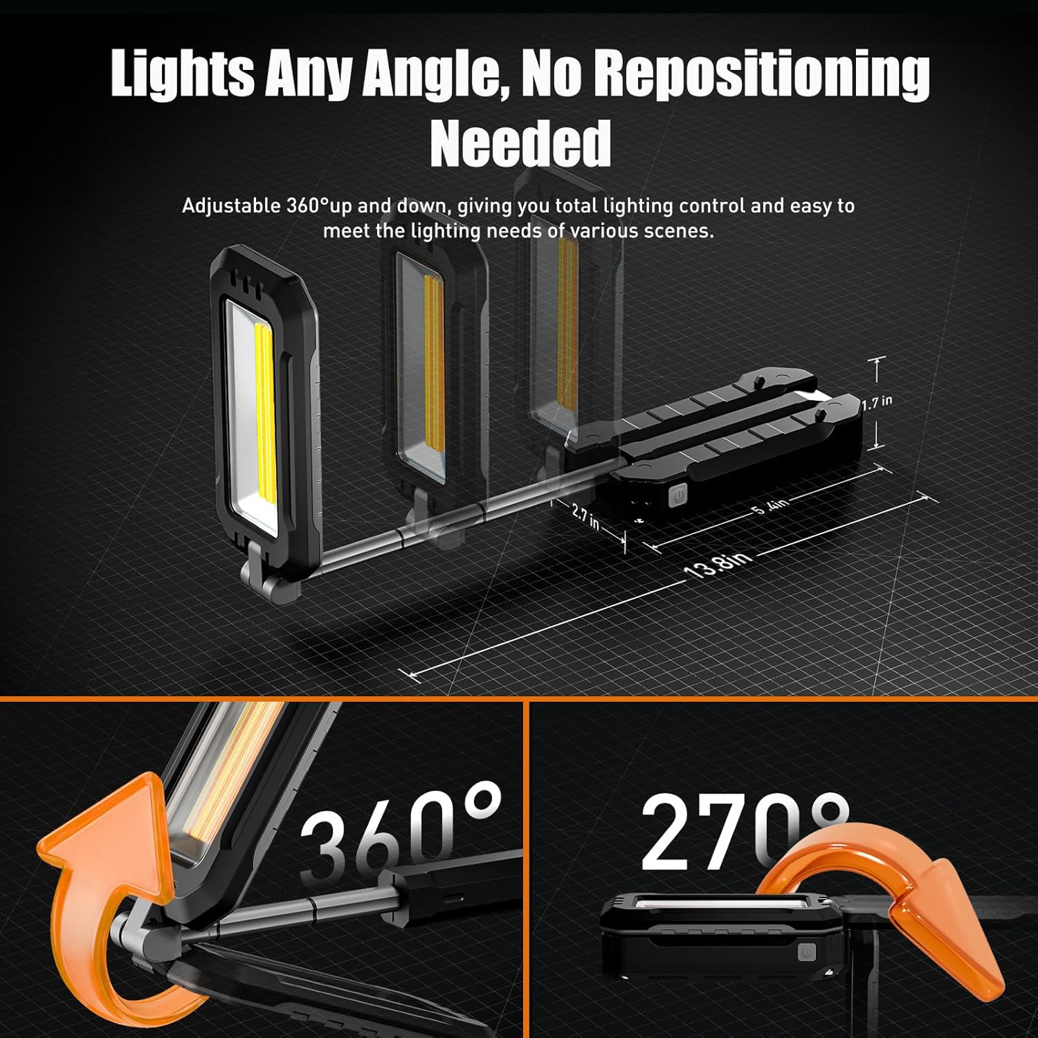 - 【Foldable & Compact Design】This portable work light features a telescopic foldable design,making it convenient to carry and store in your bag. Magnet light collapses to 5.43×2.67×1.73 inches and extending to 13.77 inches, freely adjusting height for lighting. With a strong magnetic base and 1/4" screw port, rechargeable shop light mounts easily to metal surfaces, tripods, or poles.
