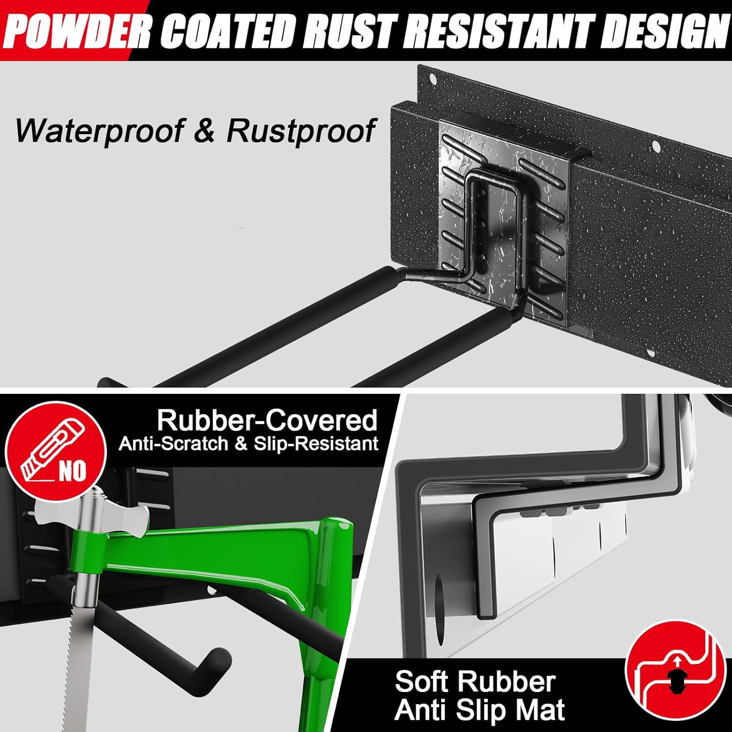 - Heavy Duty & Sturdy: Crafted from premium quality, heavy-duty alloy steel materials, our tool rack boasts an impressive 880 lbs weight capacity – strong enough to hold even your heaviest equipment. The double powder-coated finish resists rust, scratches, while rubber-coated hook arms prevent slipping and protect tool surfaces from dents, long-lasting and sturdy.